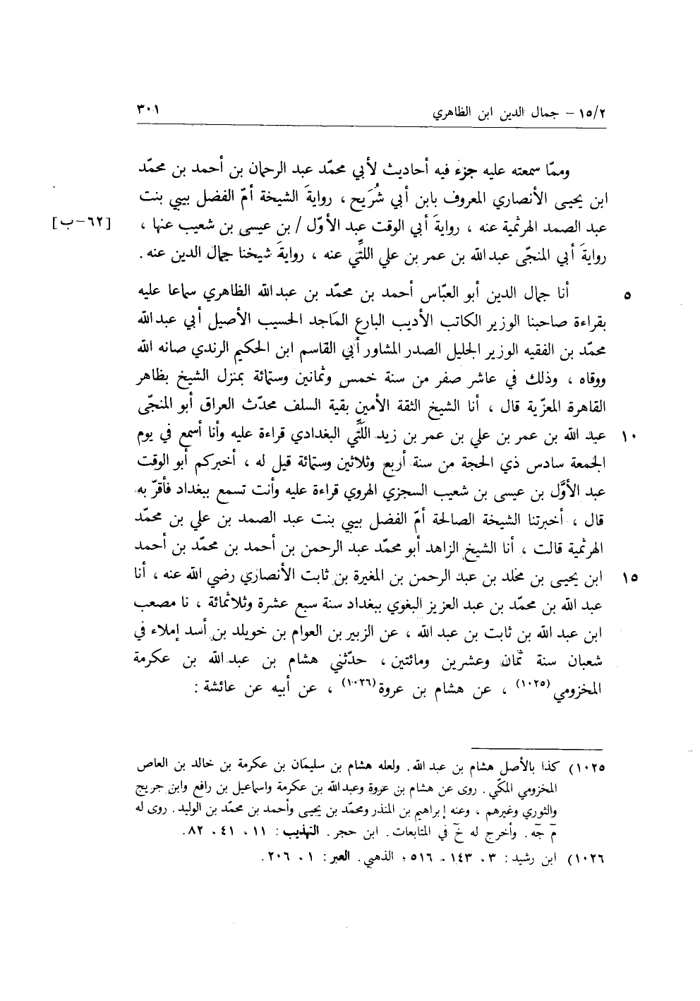 أنا جَمَالُ الدِّينِ أَبُو الْعَبَّاسِ أَحْمَدُ بْنُ مُحَمَّدِ بْنِ عَبْدِ اللَّهِ الظَّاهِرِيُّ سَمَاعًا عَلَيْهِ بِقِرَاءَةِ صَاحِبِنَا الْوَزِيرِ الْكَاتِبِ الأَدِيبِ الْبَارِعِ الْمَاجِدِ الْحَسِيبِ الأَصِيلِ أَبِي عَبْدِ اللَّهِ مُحَمَّدِ بْنِ الْفَقِيهِ الْوَزِيرِ الْجَلِيلِ الْصَدْرِ الْمُشَاوَرِ أَبِي الْقَاسِمِ بْنِ الْحَكِيمِ الرُّنْدِيُّ صَانَهُ اللَّهُ وَوَقَاهُ، وَذَلِكَ فِي عَاشِرِ صَفَرَ مِنْ سَنَةِ خَمْسٍ وَثَمَانِينَ وَسِتِّ مِائَةٍ بِمَنْزِلِ الشَّيْخِ بِظَاهِرِ الْقَاهِرَةِ الْمُعِزِّيَّةِ، قَالَ: أنا الشَّيْخُ الثِّقَةُ الأَمِينُ بِقَيَّةُ السَّلَفِ مُحَدِّثُ الْعِرَاقِ أَبُو الْمَنْجَى عَبْدُ اللَّهِ بْنُ عُمَرَ بْنِ عَلِيِّ بْنِ عُمَرَ بْنِ زَيْدٍ اللَّتِّيُّ الْبَغْدَادِيُّ قِرَاءَةً عَلَيْهِ وَأَنَا أَسْمَعُ فِي يَوْمِ الْجُمُعَةِ سَادِسِ ذِي الْحِجَّةِ مِنْ سَنَةِ أَرْبَعٍ وَثَلاثِينَ وَسِتِّ مِائَةٍ قِيلَ لَهُ: أَخْبَرَكُمْ أَبُو الْوَقْتِ عَبْدُ الأَوَّلِ بْنُ عِيسَى بْنِ شُعَيْبٍ السِّجْزِيُّ الْهَرَوِيُّ قِرَاءَةً عَلَيْهِ وَأَنْتَ تَسْمَعُ بِبَغْدَادَ فَأَقَرَّ بِهِ، قَالَ: أَخْبَرَتْنَا الشَّيْخَةُ الصَّالِحَةُ أُمُّ الْفَضْلِ بِيبِي بِنْتُ عَبْدِ الصَّمَدِ بْنِ عَلِيِّ بْنِ مُحَمَّدٍ الْهَرْثَمِيَّةُ، قَالَتْ، أنا الشَّيْخُ الزَّاهِدُ أَبُو مُحَمَّدٍ عَبْدُ الرَّحْمَنِ بْنُ أَحْمَدَ بْنِ مُحَمَّدِ بْنِ أَحْمَدَ بْنِ يَحْيَى بْنِ مَخْلَدِ بْنِ عَبْدِ الرَّحْمَنِ بْنِ الْمُغِيرَةِ بْنِ ثَابِتٍ الأَنْصَارِيُّ رَضِيَ اللَّهُ عَنْهُ، أنا عَبْدُ اللَّهِ بْنُ مُحَمَّدِ بْنِ عَبْدُ الْعَزِيزِ، الْبَغَوِيُّ بِبَغْدَادَ سَنَةَ سَبْعَ عَشْرَةَ وَثَلاثِ مِائَةٍ، نا مُصْعَبِ بْنُ عَبْدِ اللَّهِ بْنِ ثَابِتِ بْنِ عَبْدِ اللَّهِ، عَنِ الزُّبَيْرِ بْنِ الْعَوَّامِ بْنِ خُوَيْلِدِ بْنِ أَسَدٍ، إِمْلاءً فِي شَعْبَانَ سَنَةَ ثَمَانٍ وَعِشْرِينَ وَمِائَتَيْنِ، حَدَّثَنِي هِشَامُ بْنُ عَبْدِ اللَّهِ بْنِ عِكْرِمَةَ الْمَخْزُومِيُّ، عَنْ هِشَامِ بْنِ عُرْوَةَ، عَنْ أَبِيهِ عَنْ عَائِشَةَ: