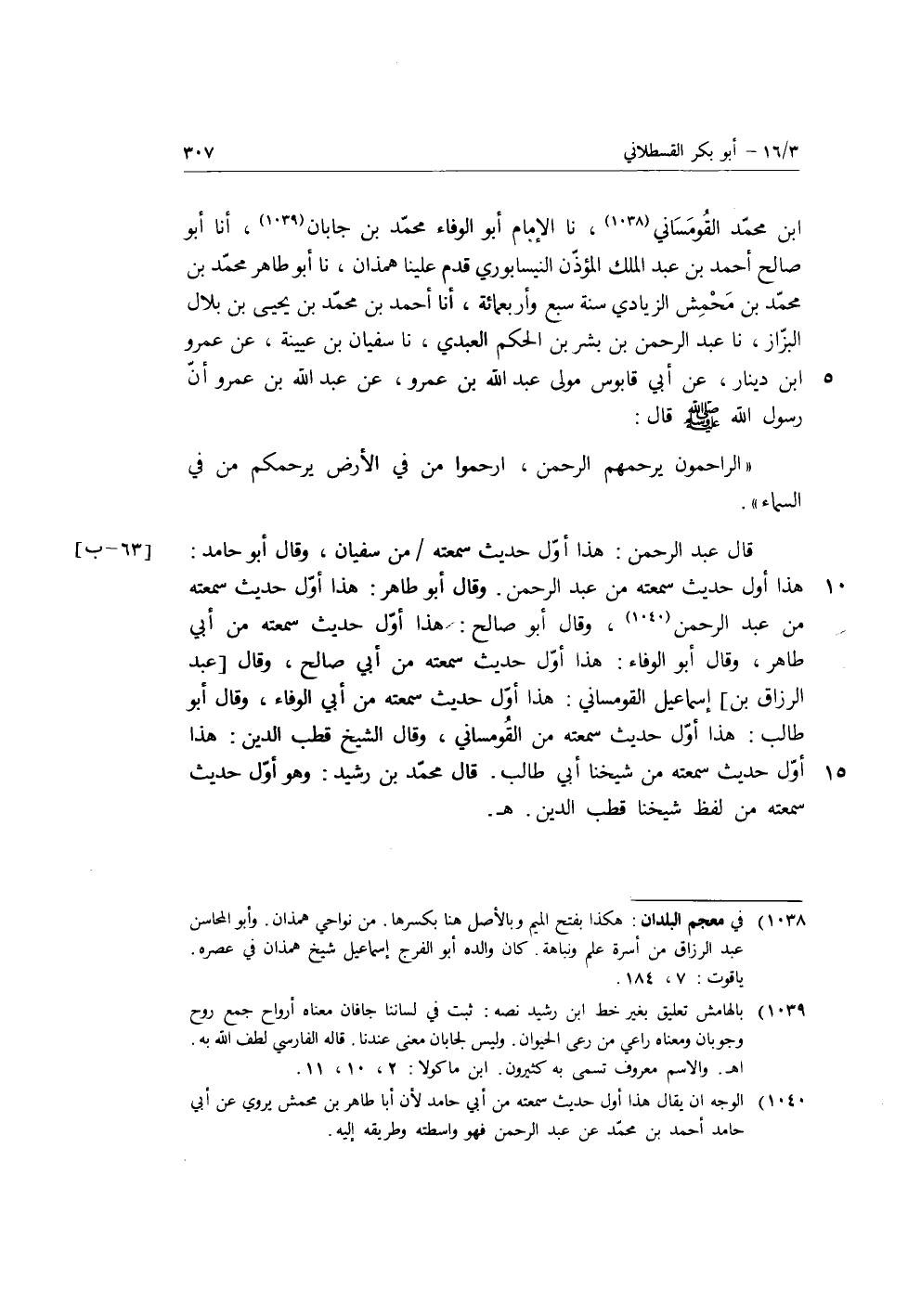 بْنِ مُحَمَّدٍ الْقَوْمَسَانِيُّ، نا الإِمَامُ أَبُو الْوَفَاءِ مُحَمَّدُ بْنُ جَابَانَ، أنا أَبُو صَالِحٍ أَحْمَدُ بْنُ عَبْدِ الْمَلِكِ، الْمُؤَذِّنُ النَّيْسَابُورِيُّ قَدِمَ عَلَيْنَا هَمَذَانَ، نا أَبُو طَاهِرٍ مُحَمَّدُ بْنُ مُحَمَّدِ بْنِ مَحْمَشَ الزِّيَادِيُّ سَنَةَ سَبْعٍ وَأَرْبَعِ مِائَةٍ، أنا أَحْمَدُ بْنُ مُحَمَّدِ بْنِ يَحْيَى بْنِ بِلالٍ الْبَزَّازُ، نا عَبْدُ الرَّحْمَنِ بْنُ بِشْرِ بْنِ الْحَكَمِ الْعَبْدِيُّ، نا سُفْيَانُ بْنُ عُيَيْنَةَ، عَنْ عَمْرِو بْنِ دِينَارٍ، عَنْ أَبْي قَابُوسٍ مَوْلَى عَبْدِ اللَّهِ بْنِ عَمْرٍو، عَنْ عَبْدِ اللَّهِ بْنِ عَمْرٍو أَنَّ رَسُولَ اللَّهِ صَلَّى اللَّهُ عَلَيْهِ وَسَلَّمَ، قَالَ: «