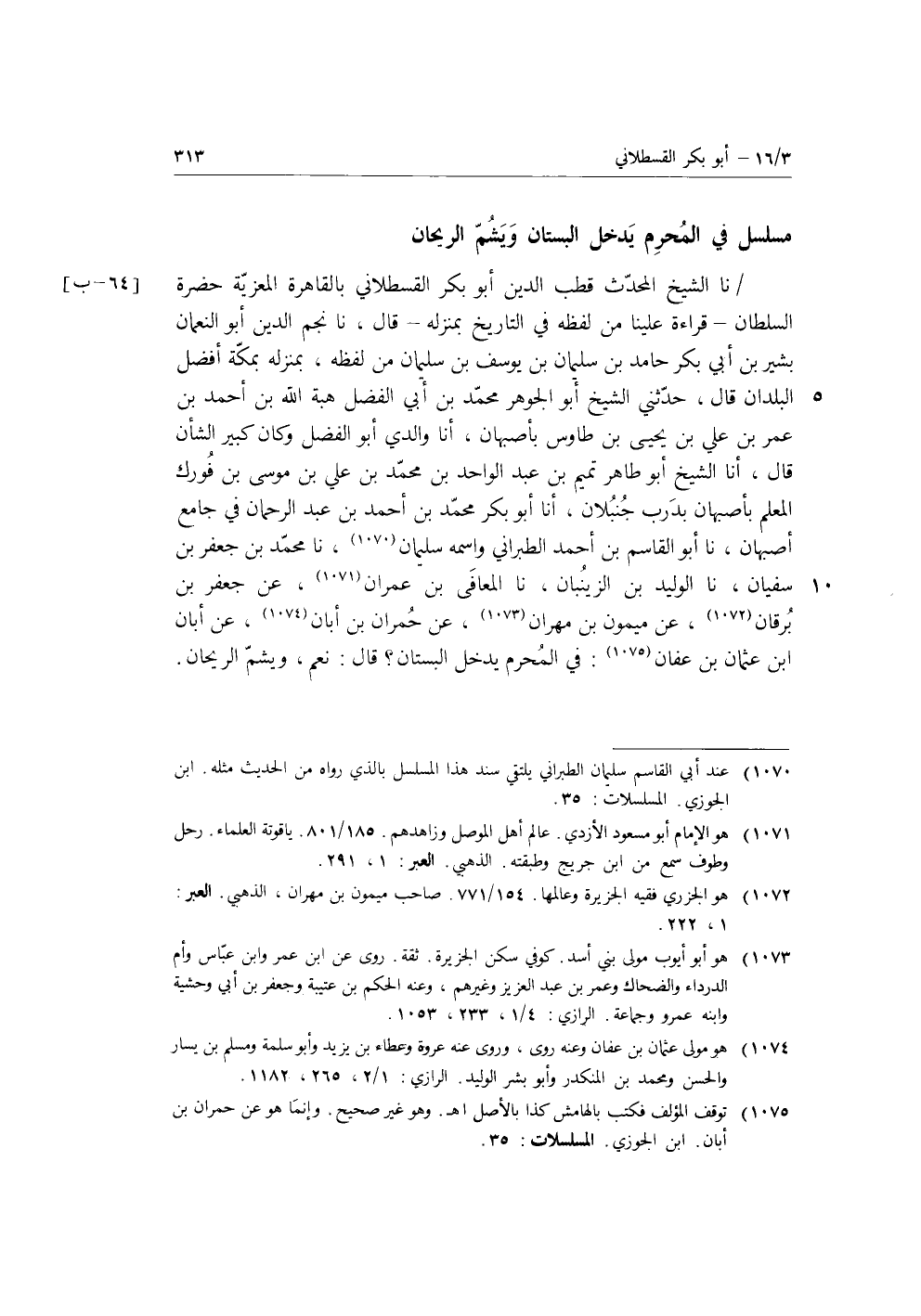 نا الشَّيْخُ الْمُحَدِّثُ قُطْبُ الدِّينِ أَبُو بَكْرٍ الْقَسْطَلانِيُّ بِالْقَاهِرَةِ الْمُعِزِّيَّةِ حَضْرَةُ السُّلْطَانِ، قِرَاءَةً عَلَيْنَا مِنْ لَفْظِهِ فِي التَّارِيخِ بِمَنْزِلِهِ، قَالَ: نا نَجْمُ الدِّينِ أَبُو النُّعْمَانِ بَشِيرُ بْنُ أَبِي بَكْرٍ حَامِدُ بْنُ سُلَيْمَانَ بْنِ يُوسُفَ بْنِ سَلْمَانَ مِنْ لَفْظِهِ، بِمَنْزِلِهِ بِمَكَّةَ أَفْضَلُ الْبِلْدَانِ، قَالَ: حَدَّثَنِي الشَّيْخُ أَبُو الْجَوْهَرِ مُحَمَّدُ بْنُ أَبِي الْفَضْلِ هِبَةُ اللَّهِ بْنُ أَحْمَدَ بْنِ عُمَرَ بْنِ عَلِيِّ بْنِ يَحْيَى بْنِ طَاوُسٍ بِأَصْبَهَانَ، أنا وَالِدِي أَبُو الْفَضْلِ وَكَانَ كَبِيرَ الشَّأْنِ قَالَ: أنا الشَّيْخُ أَبُو طَاهِرٍ تَمِيمُ بْنُ عَبْدِ الْوَاحِدِ بْنِ مُحَمَّدِ بْنِ عَلِيِّ بْنِ مُوسَى بْنِ فُورَكٍ الْمُعَلِّمُ بِأَصْبَهَانَ بِدَرْبِ جنبلانَ، أنا أَبُو بَكْرٍ مُحَمَّدُ بْنُ أَحْمَدَ بْنِ عَبْدِ الرَّحْمَنِ فِي جَامِعِ أَصْبَهَانَ، نا وَاسْمُهُ سَلْمَانَ، أَبُو الْقَاسِمِ بْنُ أَحْمَدَ الطَّبَرَانِيُّ نا مُحَمَّدُ بْنُ جَعْفَرِ بْنِ سُفْيَانَ، نا الْوَلِيدُ بْنُ الزَّيْنَبَانِ، نا الْمُعَافِي بْنُ عِمْرَانَ، عَنْ جَعْفَرِ بْنِ بُرْقَانَ، عَنْ مَيْمُونِ بْنِ مِهْرَانَ، عَنْ حُمْرَانَ بْنِ أَبَانٍ، عَنْ أَبَانِ بْنِ عُثْمَانَ بْنِ عَفَّانَ، " فِي الْمُحَرَّمِ يُدْخَلُ الْبُسْتَانُ؟ قَالَ: نَعَمْ، وَيُشَمُّ الرَّيْحَانُ ".