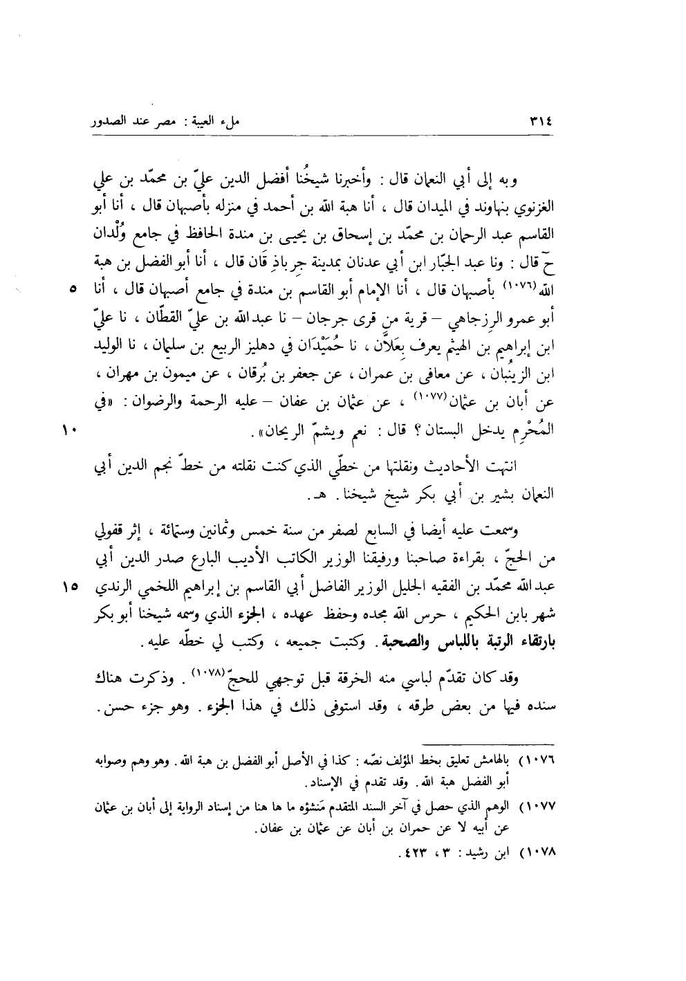 وَبِهِ إِلَى أَبِي النُّعْمَانِ، قَالَ: وَأَخْبَرَنَا شَيْخُنَا أَفْضَلُ الدِّينِ عَلَيُّ بْنُ مُحَمَّدِ بْنِ عَلِيٍّ الْغَزْنَوِيُّ بِنَهَاوَنْدَ فِي الْمَيْدَانِ، قَالَ: أنا هِبَةُ اللَّهِ بْنُ أَحْمَدَ فِي مَنْزِلِهِ بِأَصْبَهَانَ، قَالَ: أنا أَبُو الْقَاسِمِ عَبْدُ الرَّحْمَنِ بْنُ مُحَمَّدِ بْنِ إِسْحَاقَ بْنِ يَحْيَى بْنِ مَنْدَهْ الْحَافِظُ فِي جَامِعِ ولدانَ.