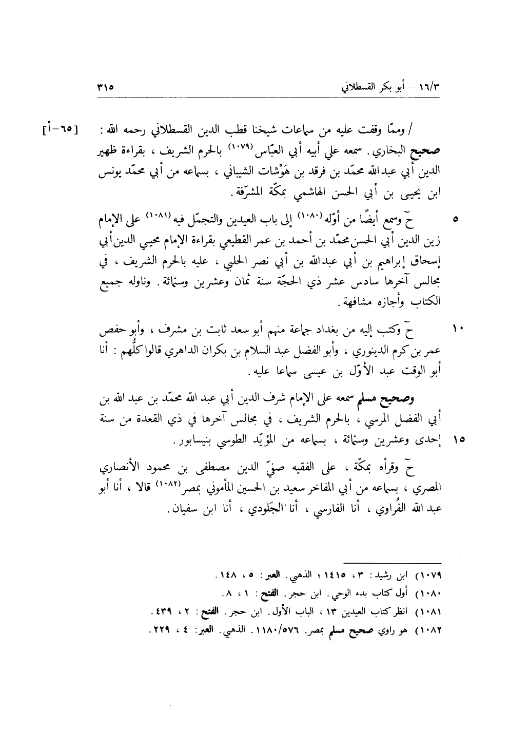 ومما وقفت عليه من سماعات شيخنا قطب الدين القسطلاني رَحِمَهُ اللَّهُ: صحيح البخاري، سمعه على أبيه أبي العباس بالحرم الشريف، بقراءة ظهير الدين أبي عَبْد اللَّهِ محمد بن فرقد بن هوشات الشيباني، بسماعه من أبي محمد بن يونس بن يَحْيَى بن أبي الحسن الهاشمي بمكة المشرفة.