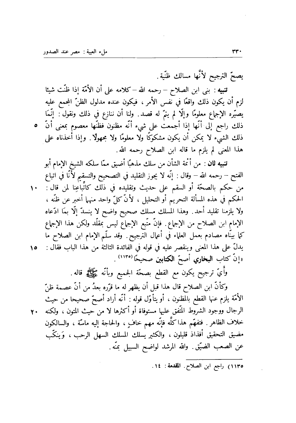تنبيه ثان: من أئمة الشأن من سلك مذهبا أضيق مما سلكه الشيخ الإمام أبو الفتح رَحِمَهُ اللَّهُ، وقال: إنه لا يجوز التقليد في التصحيح والتسقيم لأنا في اتباع من حكم بالصحة أو السقم على حديث وتقليده في ذلك كاتباعنا لمن قَالَ: الحكم في هذه المسألة التحريم أو التحليل، لأن كل واحد منهما أخبر عن ظنه، ولا يلزمنا تقليد أحد، وهذا المسلك مسلك صحيح واضح لا ينسد إلا بما ادعاه الإمام ابن الصلاح من الإجماع، فإن متبع الإجماع ليس بمقلد ولكن هذا الإجماع كما بيناه مصادم بعمل العلماء في أعمال الترجيح، وقد سلم الإمام بن الصلاح ما يدل على هذا المعنى وينقصر عليه في قوله في الفائدة الثالثة من هذا الباب فقال: إن كتاب البخاري أصح الكتابين صحيحا.