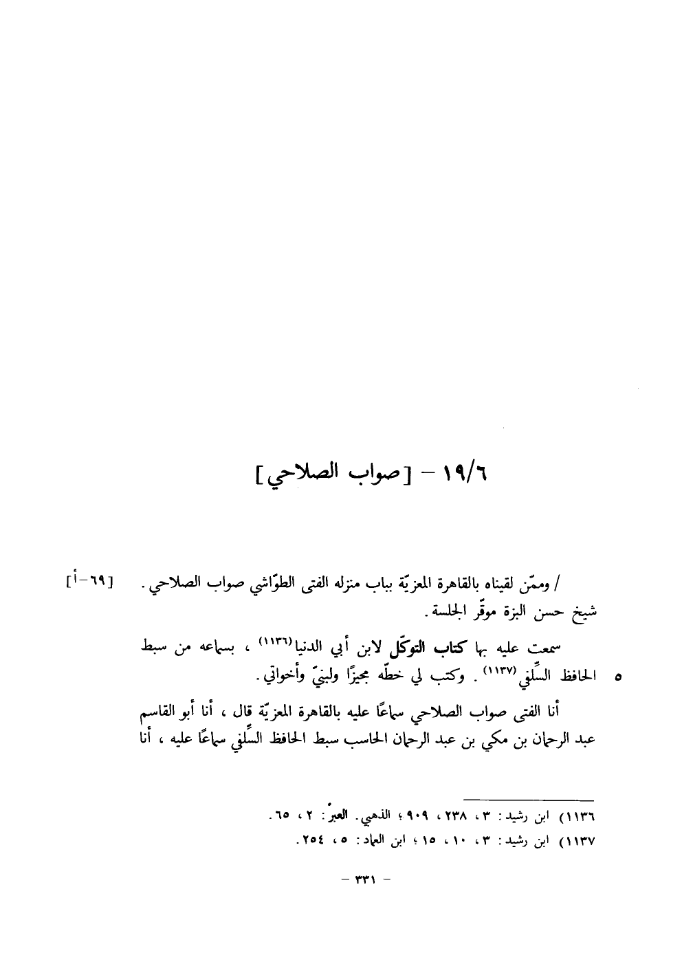 أنا الْفَتَى صَواب الصَّلاحِيُّ سَمَاعًا عَلَيْهِ بِالْقَاهِرَةِ الْمُعِزِّيَّةِ، قَالَ: أنا أَبُو الْقَاسِمِ عَبْدُ الرَّحْمَنِ بْنُ مَكِّيِّ بْنِ عَبْدِ الرَّحْمَنِ الْحَاسِبُ سِبْطُ الْحَافِظِ السِّلَفِيُّ سَمَاعًا عَلَيْهِ، أنا