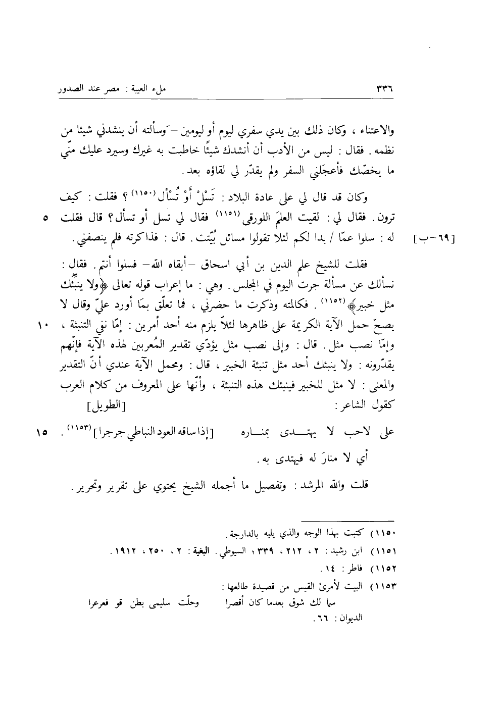 فقلت للشيخ علم الدين بن أبي إِسْحَاق، أبقاه الله، فسلوا أنتم، فقال: نسألك عن مسألة جرت اليوم في المجلس، وهي: ما إعراب قوله تعالى: {وَلا يُنَبِّئُكَ مِثْلُ خَبِيرٍ} [فاطر: 14] فكالمته وذكرت ما حضرني، فما تعلق بما أورد علي وقال لا يصح حمل الآية الكريمة على ظاهرها لئلا يلزم منه أحد أمرين: إما نفي التنبئة، وإما نصب مثل، قَالَ: وإلى نصب مثل يؤدي تقدير المعربين لهذه الآية فإنهم يقدرونه: ولا ينبئك أحد مثل تنبئة الخبير، قَالَ: ومحمل الآية عندي أن التقدير والمعنى: لا مثل للخبير فينبئك هذه التنبئة، وأنها على المعروف من كلام العرب كقول الشاعر: