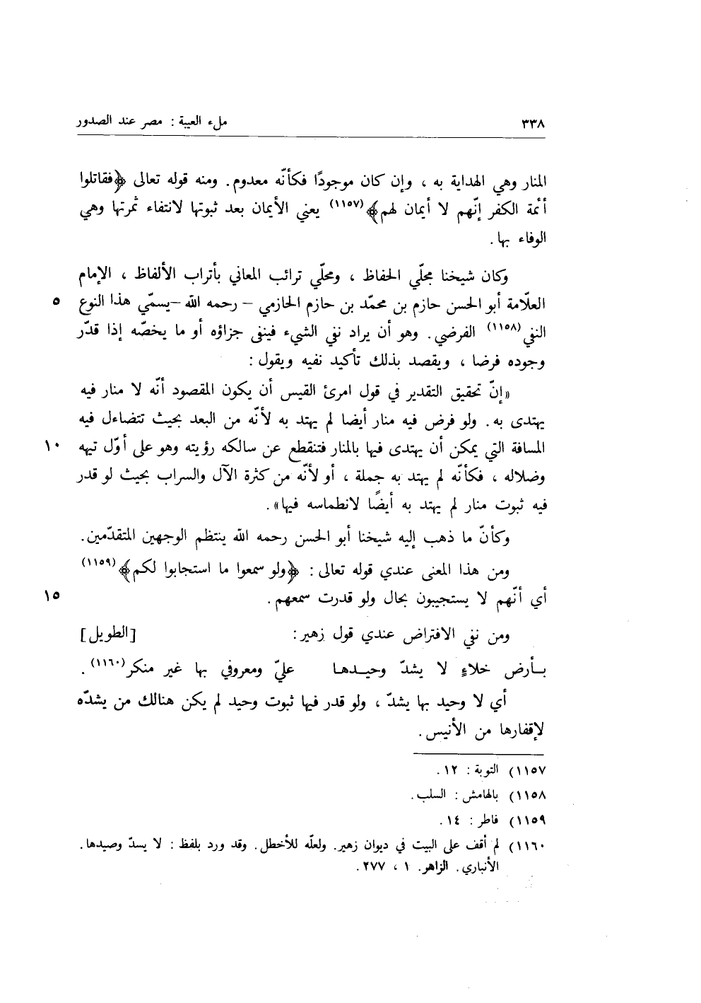 وكان شيخنا مجلي الحفاظ، ومحلي ترائب المعاني بأتراب الألفاظ، الإمام العلامة أَبُو الْحَسَنِ حازم بن مُحَمَّدِ بْنِ حازم الحازمي، رَحِمَهُ اللَّهُ، يسمي هذا النوع النفي الفرضي، وهو أن يراد نفي الشيء، فينفي جزاؤه، أو ما يخصه إذا قدر وجوده فرضا، ويقصد بذلك تأكيد نفيه ويقول: إن تحقيق التقدير في قول امرئ القيس أن يكون المقصود أنه لا منار فيه يهتدي به، ولو فرض فيه منار أيضا لم يهتد به لأنه من البعد بحيث تتضاءل فيه المسافة التي يمكن أن يهتدي فيها بالمنار فتنقطع عن سالكه، رؤيته وهو على أول تيهه وضلاله، فكأنه لم يهتد به جملة، أو لأنه كثرة الآل والسراب بحيث لو قدر فيه ثبوت منار لم يهتد به أيضا لانطماسه فيها وكأن ما ذهب إليه شيخنا أَبُو الْحَسَنِ رَحِمَهُ اللَّهُ ينتظم الوجهين المتقدمين ومن هذا المعنى عندي قوله تعالى {وَلَوْ سَمِعُوا مَا اسْتَجَابُوا لَكُمْ} [فاطر: 14] أي أنهم لا يستجيبون بحال ولو قدرت سمعهم.