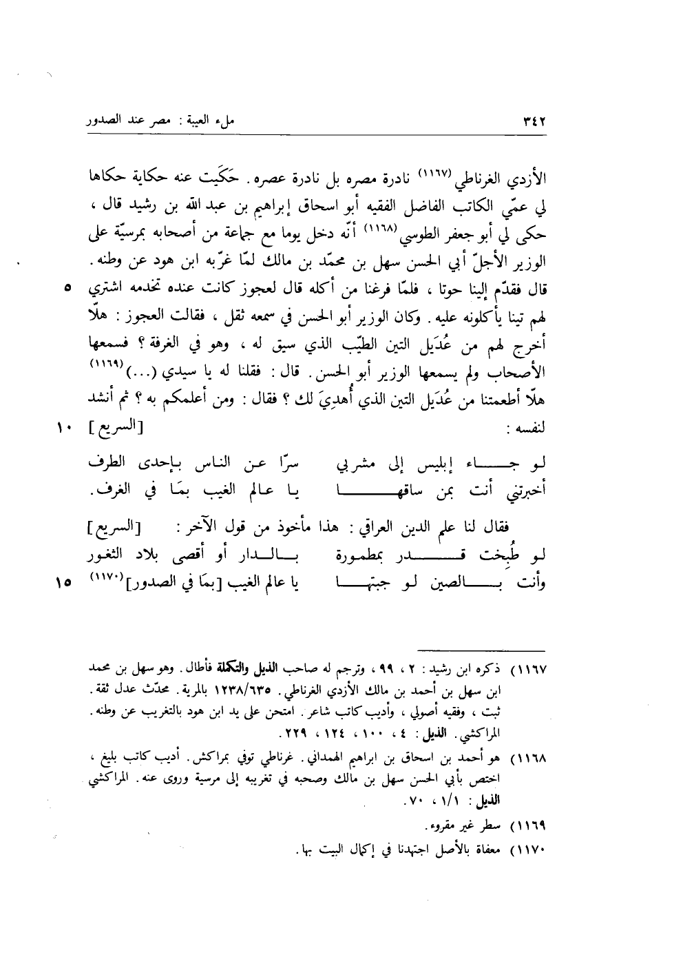 الأزدي الغرناطي، نادرة مصره بل نادرة عصره، حكيت عنه حكاية حكاها لي عمي الكاتب الفاضل الفقيه أَبُو إِسْحَاقَ إبراهيم بن عَبْدِ اللَّهِ بْنِ رشيد، قَالَ: حكى لي أبو جعفر الطوسي أنه دخل يوما مع جماعة من أصحابه بمرسية على الوزير الأجل أبي الحسن سهل بن مُحَمَّدِ بْنِ مالك لما غربه ابن هود عن وطنه، قَالَ: فقدم إلينا حوتا، فلما فرغنا من أكله، قَالَ لعجوز كانت عنده تخدمه اشتري لهم تينا يأكلونه عليه، وكان الوزير أَبُو الْحَسَنِ في سمعه ثقل، فقالت العجوز: هلا أخرج لهم من عديل التين الطيب الذي سيق له، وهو في الغرفة؟ فسمعها الأصحاب ولم يسمعها الوزير أَبُو الْحَسَنِ، قَالَ: فقلنا له يا سيدي. . . . . . . . . . هلا أطعمتنا من عديل التين الذي أهدي لك؟ فقال: ومن أعلمكم به؟ ثم أنشد لنفسه: