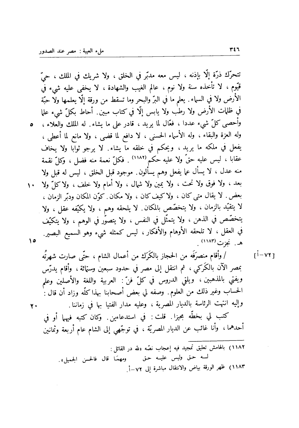 تتحرك ذرة إلا بإذنه، ليس معه مدبر في الخلق، ولا شريك في الملك، حي قيوم، لا تأخذه سنة ولا نوم، عالم الغيب والشهادة، لا يخفي عليه شيء في الأرض ولا في السماء، يعلم ما في البر والبحر وما تسقط من ورقة إلا يعلمها ولا حبة في ظلمات الأرض ولا رطب ولا يابس إلا في كتاب مبين، أحاط بكل شيء علما، وأحصى كل شيء عددا، فعال لما يريد، قادر على ما يشاء، له الملك والعلاء، وله العزة والبقاء، وله الأسماء الحسنى، لا دافع لما قضى، ولا مانع لما أعطى، يفعل في ملكه ما يريد، ويحكم في خلقه ما يشاء، لا يرجو ثوابا ولا يخاف عقابا، ليس عليه حق ولا عليه حكم، فكل نعمة منه فضل، وكل نقمة منه عدل، لا يسأل عما يفعل وهم يسألون، موجود قبل الخلق، ليس له قبل ولا بعد، ولا فوق ولا تحت، ولا يمين ولا شمال، ولا أمام ولا خلف، ولا كل ولا بعض لا يقال متى كان، ولا كيف كان، ولا مكان كون المكان ودبر الزمان، لا يتقيد بالزمان، ولا يتخصص بالمكان، لا يلحقه وهم، ولا يكيفه عقل، ولا يتخصص في الذهن، ولا يتمثل في النفس، ولا يتصور في الوهم، ولا يتكيف في العقل، لا تلحقه الأوهام والأفكار، ليس كمثله شيء وهو السميع البصير.