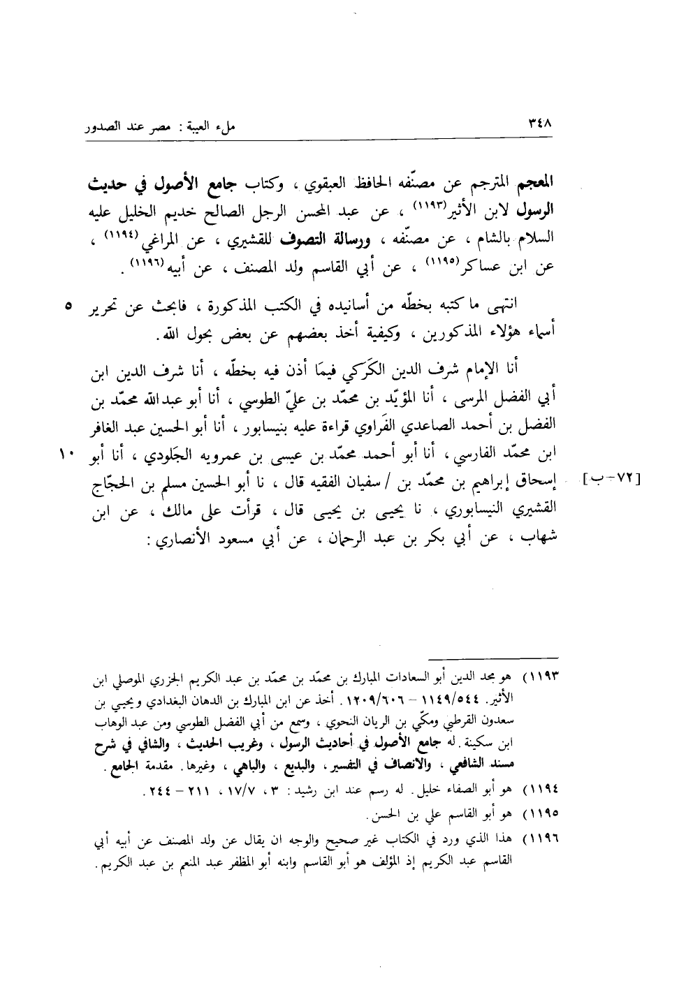 المعجم المترجم عن مصنفه الحافظ العبقوي، وكتاب جامع الأصول في حديث الرسول لابن الأثير، عن عبد المحسن الرجل الصالح خديم الخليل عليه السلام بالشام، عن مصنفه، ورسالة التصوف للقشيري، عن المراغي، عن ابن عساكر، عن أبي القاسم ولد المصنف، عن أبيه.