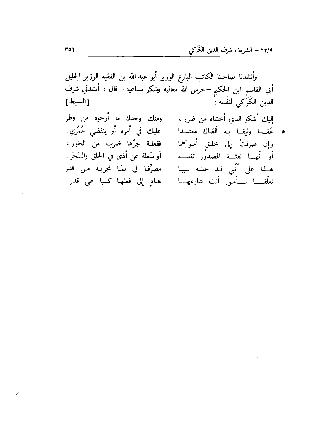 وأنشدنا صاحبنا الكاتب البارع الوزير أَبُو عَبْد اللَّهِ بن الفقيه الوزير الجليل أبي القاسم بن الحكيم، حرس الله معاليه وشكر مساعية، قَالَ: أنشدني شرف الدين الكركي لنفسه: