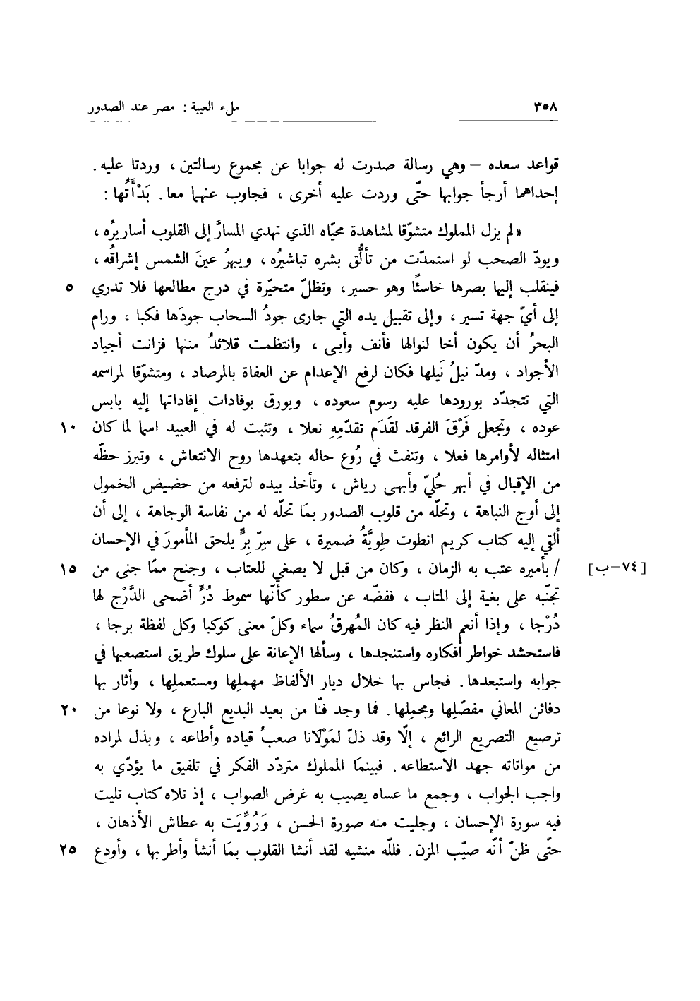قواعد سعده، وهي رسالة صدرت له جوابا عن مجموع رسالتين، وردتا عليه، إحداهما أرجأ جوابها حتى وردت عليه أخرى، فجاوب عنهما معا، بدأتها: «لم يزل المملوك متشوقا لمشاهدة محياه الذي تهدي المسار إلى القلوب أساريره ويود الصحب لو استمدت من تألق بشره تباشيره، ويبهر عين الشمس إشراقه، فينقلب إليها بصرها خاسئا وهو حسير، وتظل متحيرة في درج مطالعها فلا تدري إلى أي جهة تسير، والى تقبيل يده التي جارى جود السحاب جودها فكبا، ورام البحر أن يكون أخا لنوالها فانف وأبي، وانتظمت قلائد مننها فزانت أجياد الأجواد، ومد نيل نيلها فكان لرفع الإعدام عن العفاة بالمرصاد، ومتشوقا لمراسمه التي تتجدد بورودها عليه رسوم سعوده، ويورق بوفادات إفاداتها إليه يابس عوده، وتجعل فرق الفرقد لقدم تقدمه نعلا، وتثبت له في العبيد اسما لما كان امتثاله لأوامرها فعلا، وتنفث في روع حاله بتعهدها روح الانتعاش، وتبرز حظه من الإقبال في أبهر حلي وأبهي رياش، وتأخذ بيده لترفعه في حضيض الخمول إلى أوج النباهة، وتحله من قلوب الصدور بما تحله له من نفاسه الوجاهة، إلى أن ألقي إليه كتاب كريم انطوت طوية ضميرة على سر بر يلحق المأمور في الإحسان بأميره عتب به الزمان، وكان من قبل لا يصغى للعتاب، وجنح مما جنى من تجنبه على بغية إلى المتاب، ففضه عن سطور كأنها سموط در أضحى الدرج لها درجا، وإذا أنعم النظر فيه كان المهرق سماء وكل معنى كوكبا وكل لفظة برجا، فاستحشد خواطر أفكاره واستنجدها، وسألها الإعانة على سلوك طريق استصعبها في جوابه واستبعدها، فجاس بها خلال ديار الألفاظ مهملها ومستعملها وأثار بها دفائن المعاني مفصلها ومجملها، فما وجد فنا من بعيد البديع البارع، ولا نوعا من ترصيع التصريع الرائع، إلا وقد ذل لمولانا صعب قياده وأطاعه، وبذل لمراده من مواتاته جهد الاستطاعة، فبينما المملوك متردد الفكر في تلفيق ما يؤدي به واجب الجواب، وجمع ما عساه يصيب به غرض الصواب، إذ تلاه كتاب تليت فيه سورة الإحسان، وجليت منه صورة الحسن، ورويت به عطاش الأذهان حتى ظن أنه صيب المزن، فلله منشيه لقد أنشأ القلوب، بما أنشأ وأطربها بها، وأودع