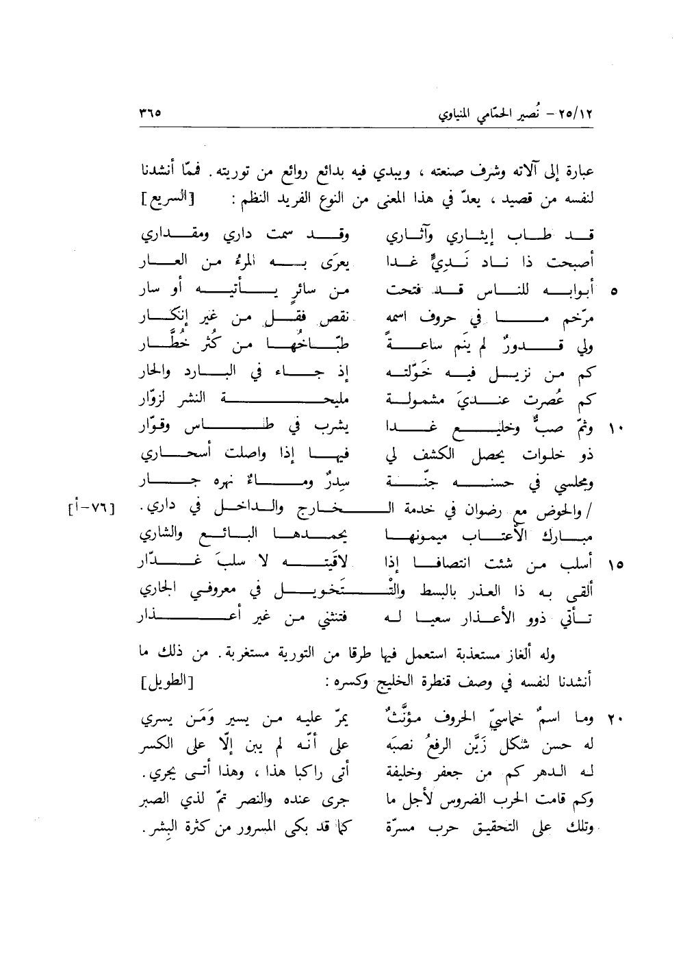 عبارة إلى آلاته وشرف صنعته، ويبدي فيه بدائع روائع من توريته، فمما أنشدنا لنفسه من قصيد، يعد في هذا المعنى من النوع الفريد النظم:
