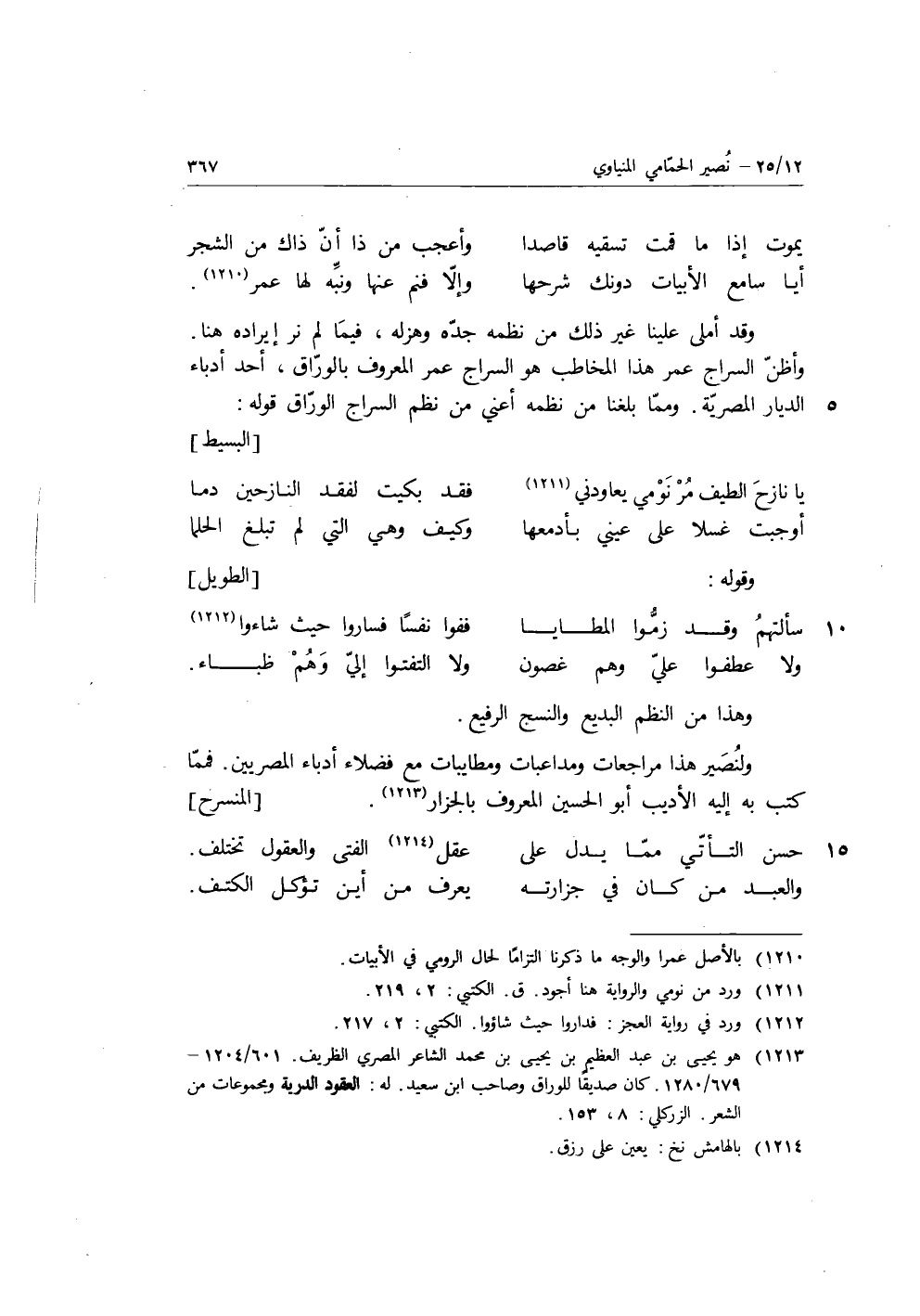 وقد أملى علينا غير ذلك من نظمه جده وهزله، فيما لم نر إيراده هنا، وأظن السراج عمر هذا المخاطب هو السراج عمر المعروف بالوراق أحد أدباء الديار المصرية، ومما بلغنا من نظمه أعني من نظم السراج الوراق قوله: