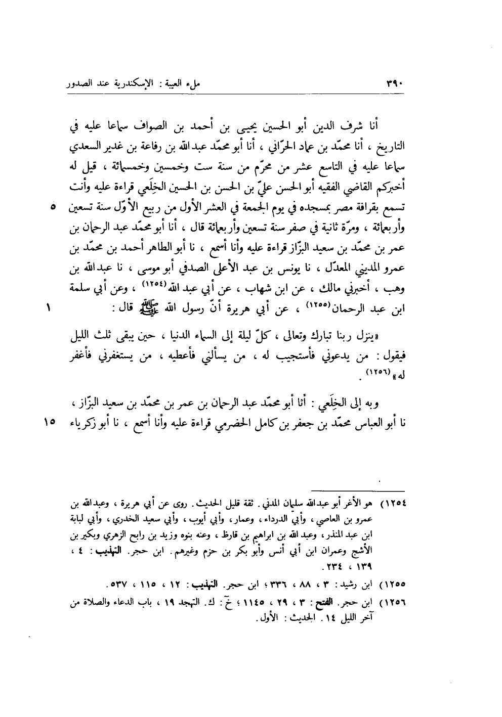 أنا شَرَفُ الدِّينِ أَبُو الْحُسَيْنِ يَحْيَى بْنُ أَحْمَدَ بْنِ الصَّوَّافِ سَمَاعًا عَلَيْهِ فِي التَّارِيخِ، أنا مُحَمَّدُ بْنُ عِمَادٍ الْحَرَّانِيُّ، أنا أَبُو مُحَمَّدِ بْنُ عَبْدِ اللَّهِ بْنِ رِفَاعَةَ بْنِ غَدِيرٍ السَّعْدِيُّ سَمَاعًا عَلَيْهِ فِي التَّاسِعَ عَشَرَ مِنْ مُحَرَّمَ مِنْ سَنَةِ سِتٍّ وَخَمْسِينَ وَخَمْسِ مِائَةٍ، قِيلَ لَهُ أَخْبَرَكُمُ الْقَاضِي الْفَقِيهُ أَبُو الْحَسَنِ عَلِيُّ بْنُ الْحَسَنِ بْنِ الْحُسَيْنِ الْخِلَعِيُّ قِرَاءَةً عَلَيْهِ وَأَنْتَ تَسْمَعُ بِقَرَافَةِ مِصْرَ بِمَسْجِدِهِ فِي يَوْمِ الْجُمُعَةِ فِي الْعَشْرِ الأَوَّلِ مِنْ رَبِيعٍ الأَوَّلِ سَنَةَ تِسْعِينَ وَأَرْبَعِ مِائَةٍ، وَمَرَّةً ثَانِيَةً فِي صَفَرَ سَنَةَ تِسْعِينَ وَأَرْبَعِ مِائَةٍ، قَالَ، أنا أَبُو مُحَمَّدٍ عَبْدُ الرَّحْمَنِ بْنُ عُمَرَ بْنِ مُحَمَّدِ بْنِ سَعِيدٍ الْبَزَّازُ قِرَاءَةً عَلَيْهِ وَأَنَا أَسْمَعُ، نا أَبُو الطَّاهِرِ أَحْمَدُ بْنُ مُحَمَّدِ بْنِ عَمْرٍو الْمَدِينِيُّ الْمُعَدَّلُ، نا يُونُسُ بْنُ عَبْدِ الأَعْلَى الصَّدَفِيُّ أَبُو مُوسَى، نا عَبْدُ اللَّهِ بْنُ وَهْبٍ، أَخْبَرَنِي مَالِكٌ، عَنِ ابْنِ شِهَابٍ، عَنْ أَبِي عَبْدِ اللَّهِ، وَعَنْ أَبِي سَلَمَةَ بْنِ عَبْدِ الرَّحْمَنِ، عَنْ أَبِي هُرَيْرَةَ أَنَّ رَسُولَ اللَّهِ صَلَّى اللَّهُ عَلَيْهِ وَسَلَّمَ، قَالَ: "