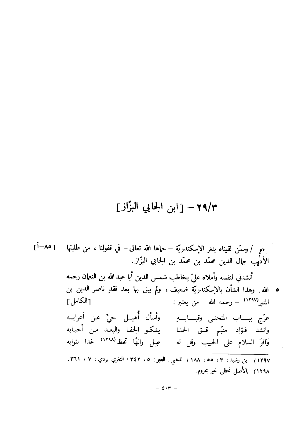 أنشدني لنفسه وأملاه علي يخاطب شمس الدين أبا عَبْد اللَّهِ بن النعمان رَحِمَهُ اللَّهُ عز وجل، وهذا الشأن بالإسكندرية ضعيف، ولم يبق بها بعد فقد ناصر الدين بن المنير رَحِمَهُ اللَّهُ، من يعتبر: