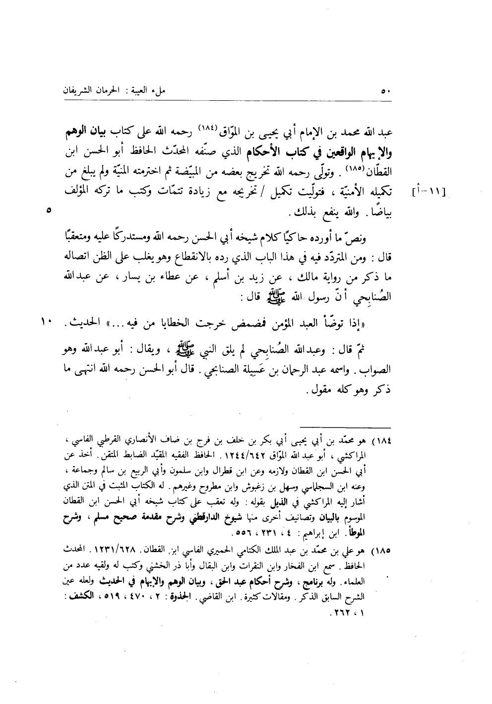 عبد الله محمد بن الإمام أبي يحيى بن المواق رحمه الله على كتاب بيان الوهم والإيهام الواقعين في كتاب الأحكام الذي صنفه المحدث الحافظ أبو الحسن بن القطان، وتولى رحمه الله تخريج بعضه من المبيضة ثم احترمته المنية ولم يبلغ من تكميله الأمنية، فتوليت تكميل تخريجه مع زيادة تتمات وكتب ما تركه المؤلف بياضا والله ينفع بذلك.