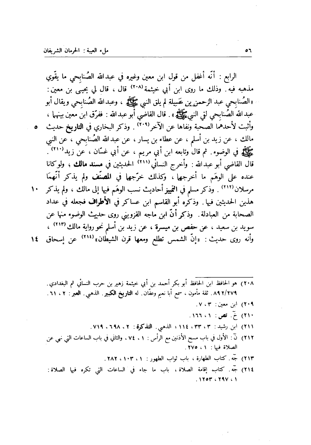 الرابع: أنه أغفل من قول ابن معين وغيره في عبد الله الصنابحي ما يقوي مذهبه فيه، وذلك ما روى ابن أبي خيثمة، قَالَ: قَالَ لي يحيى بن معين: الصنابحي عبد الرحمن بن عسيلة لم يلق النبي صَلَّى اللَّهُ عَلَيْهِ وَسَلَّمَ، وعبد الله الصنابحي، ويقال أبو عبد الله الصنابحي لقي النبي صَلَّى اللَّهُ عَلَيْهِ وَسَلَّمَ، قَالَ القاضي أبو عبد الله: ففرق ابن معين بينهما، وأثبت لأحدهما الصحبة ونفاها عن الآخر، وذكر البخاري في التاريخ حديث مالك، عن زيد بن أسلم، عن عطاء بن يسار، عن عبد الله الصنابحي، عن النبي صَلَّى اللَّهُ عَلَيْهِ وَسَلَّمَ في الوضوء، ثم قَالَ وتابعه ابن أبي مريم، عن أبي غسان، عن زيد، قَالَ القاضي أبو عبد الله: وأخرج النسائي، الحديثين في مسند مالك، ولو كانا عنده على الوهم ما أخرجهما، وكذلك خرجهما في المصنف ولم يذكر أنهما مرسلان، وذكر مسلم في التمييز أحاديث نسب الوهم فيها إلى مالك، ولم يذكر هذين الحديثين فيها، وذكره أبو القاسم ابن عساكر في الأطراف فجعله في عداد الصحابة من العبادلة، وذكر ابن ماجه القزويني روى حديث الوضوء منها عن سويد بن سعيد، عن حفص بن ميسرة، عن زيد بن أسلم، نحو رواية مالك، وأنه روى حديث «إن الشمس تطلع ومعها قرن الشيطان» ، عن إسحاق