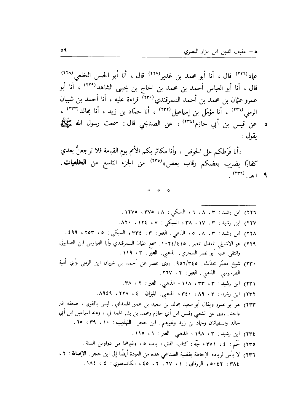 عِمَادٍ، قَالَ: أنا أَبُو مُحَمَّدِ بْنُ غَدِيرٍ، قَالَ: أنا أَبُو الْحَسَنِ الْخِلَعِيُّ، قَالَ: أنا أَبُو الْعَبَّاسِ أَحْمَدُ بْنُ مُحَمَّدِ بْنِ الْحَاجِّ بْنِ يَحْيَى الشَّاهِدُ، أنا أَبُو عَمْرٍو عُثْمَانُ بْنُ مُحَمَّدِ بْنِ أَحْمَدَ السَّمَرْقَنْدِيُّ، قِرَاءَةً عَلَيْهِ، أنا أَحْمَدُ بْنُ شَيْبَانَ الرَّمْلِيُّ، أنا مُؤَمَّلُ بْنُ إِسْمَاعِيلَ، أنا حَمَّادُ بْنُ زَيْدٍ، أنا مُجَالِدٌ، عَنْ قَيْسِ بْنِ أَبِي حَازِمٍ، عَنِ الصُّنَابِحِيِّ، قَالَ: سَمِعْتُ رَسُولَ اللَّهِ صَلَّى اللَّهُ عَلَيْهِ وَسَلَّمَ، يَقُولُ: «