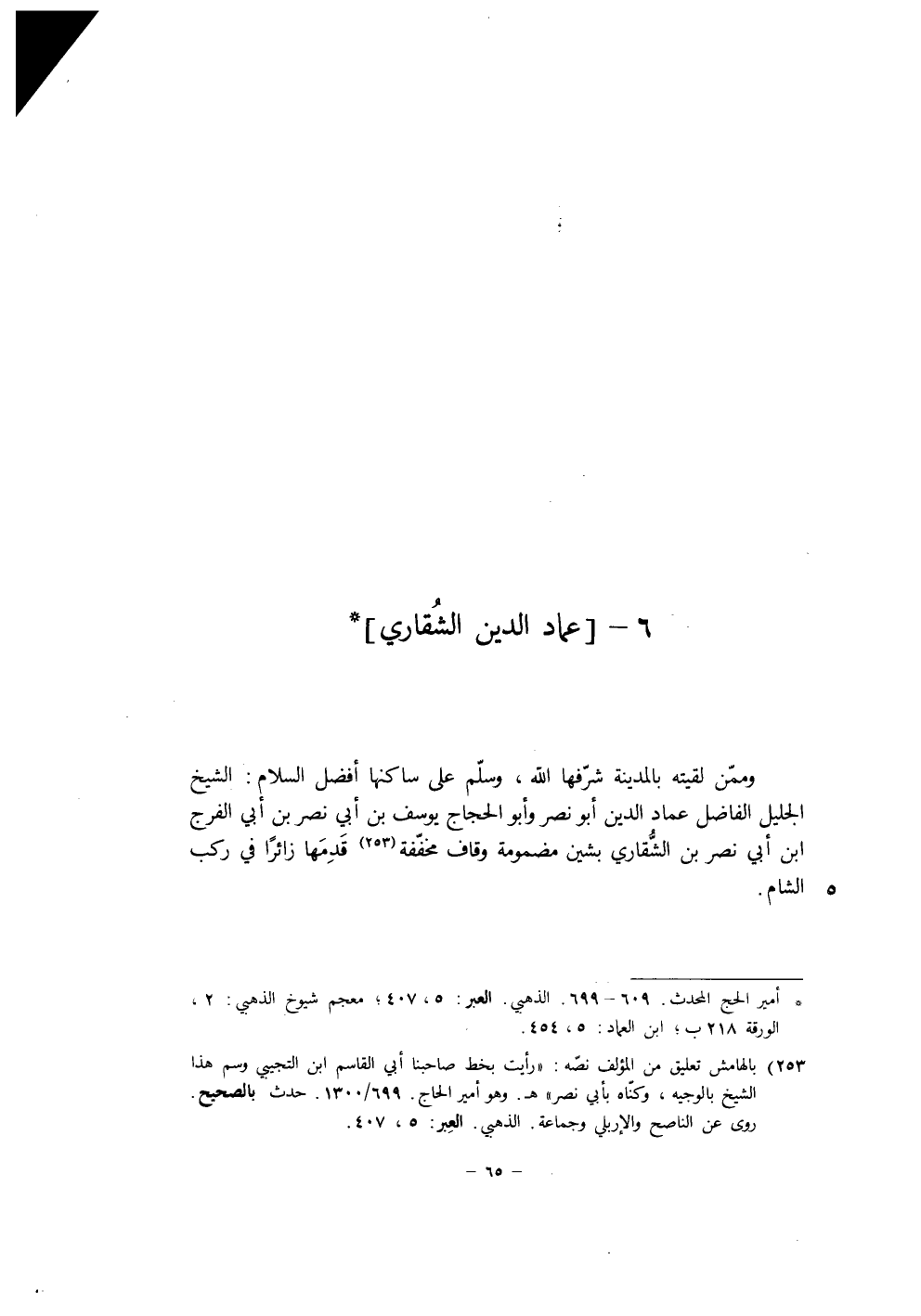 عماد الدين الشقاري وممن لقيته بالمدينة شرفها الله، وسلم على ساكنها أفضل السلام: الشيخ الجليل الفاضل عماد الدين أبو نصر وأبو الحجاج يوسف بن أبي نصر بن أبي الفرج بن أبي نصر بن الشقاري بشين مضمومة وقاف مخففة قدمها زائرا في ركب الشام.