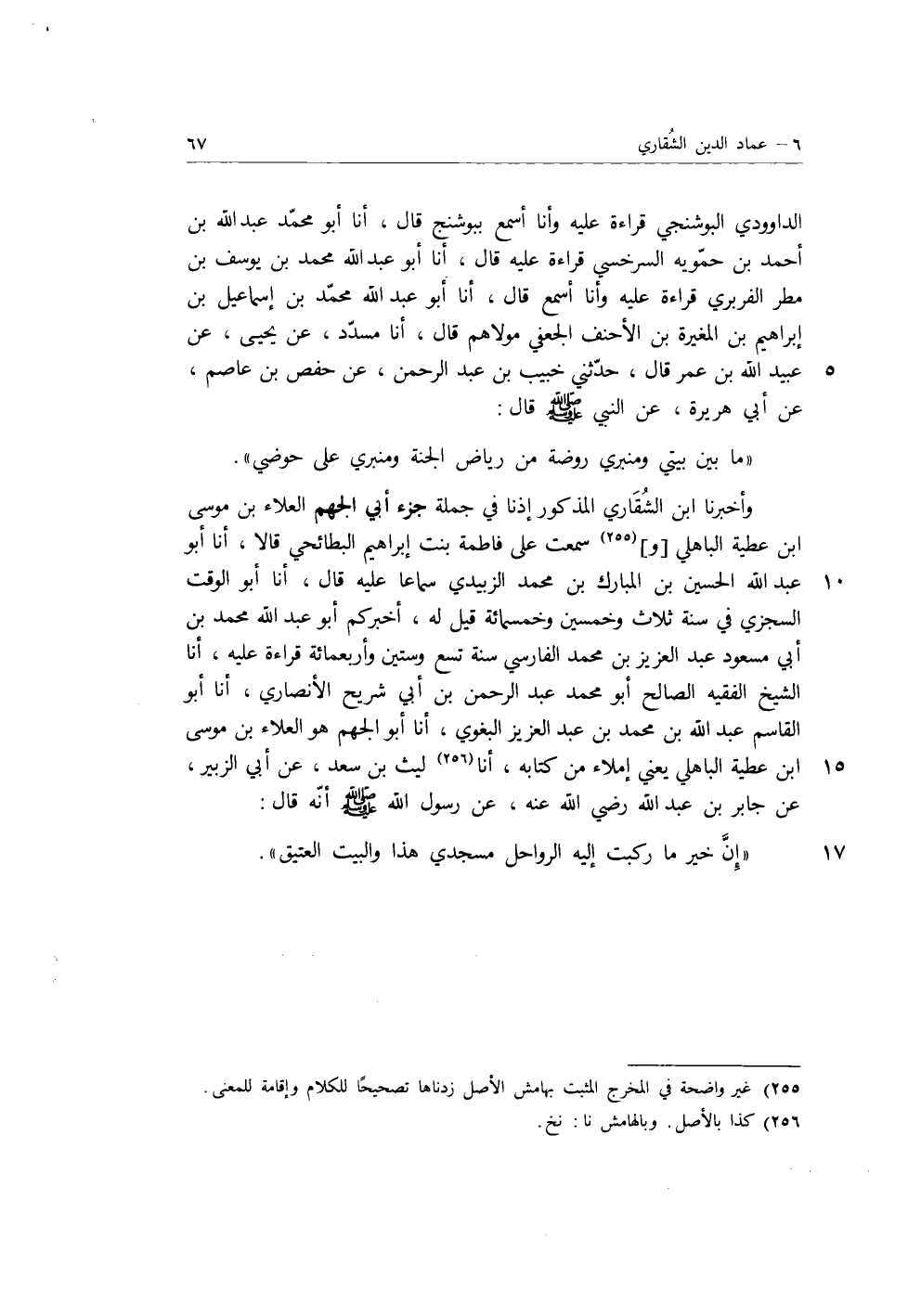 وَأَخْبَرَنَا ابْنُ الشَّاقرِيِّ الشَّقارِيُّ، الْمَذْكُورُ إِذْنًا فِي جُمْلَةِ جُزْءِ أَبِي الْجَهْمِ الْعَلاءِ بْنِ مُوسَى بْنِ عَطِيَّةَ الْبَاهِلِيِّ، وَسَمِعْتُ عَلَى فَاطِمَةَ بِنْتِ إِبْرَاهِيمَ الْبَطَائِحِيِّ، قَالا: أنا أَبُو عَبْدِ اللَّهِ الْحُسَيْنُ بْنُ الْمُبَارَكِ بْنِ مُحَمَّدٍ الزُّبَيْدِيُّ سَمَاعًا عَلَيْهِ، قَالَ: أنا أَبُو الْوَقْتِ السِّجْزِيُّ فِي سَنَةِ ثَلاثٍ وَخَمْسِينَ وَخَمْسِ مِائَةٍ قِيلَ لَهُ، أَخْبَرَكُمْ أَبُو عَبْدِ اللَّهِ مُحَمَّدُ بْنُ أَبِي مَسْعُودٍ عَبْدُ الْعَزِيزِ بْنُ مُحَمَّدٍ الْفَارِسِيُّ سَنَةَ تِسْعٍ وَسِتِّينَ وَأَرْبَعِ مِائَةٍ قِرَاءَةً عَلَيْهِ، أنا الشَّيْخُ الْفَقِيهُ الصَّالِحُ أَبُو مُحَمَّدٍ عَبْدُ الرَّحْمَنِ بْنُ أَبِي شُرَيْحٍ الأَنْصَارِيُّ، أنا أَبُو الْقَاسِمِ عَبْدُ اللَّهِ بْنُ مُحَمَّدِ بْنِ عَبْدِ الْعَزِيزِ الْبَغَوِيُّ، أنا أَبُو الْجَهْمِ هُوَ الْعَلاءُ بْنُ مُوسَى بْنِ عَطِيَّةَ الْبَاهِلِيُّ يَعْنَي إِمْلاءً مِنْ كِتَابِهِ، أنا لَيْثُ بْنُ سَعْدٍ، عَنْ أَبِي الزُّبَيْرِ، عَنْ جَابِرِ بْنِ عَبْدِ اللَّهِ رَضِيَ اللَّهُ عَنْهُ، عَنْ رَسُولِ اللَّهِ صَلَّى اللَّهُ عَلَيْهِ وَسَلَّمَ، أَنَّهُ قَالَ: «إِنَّ