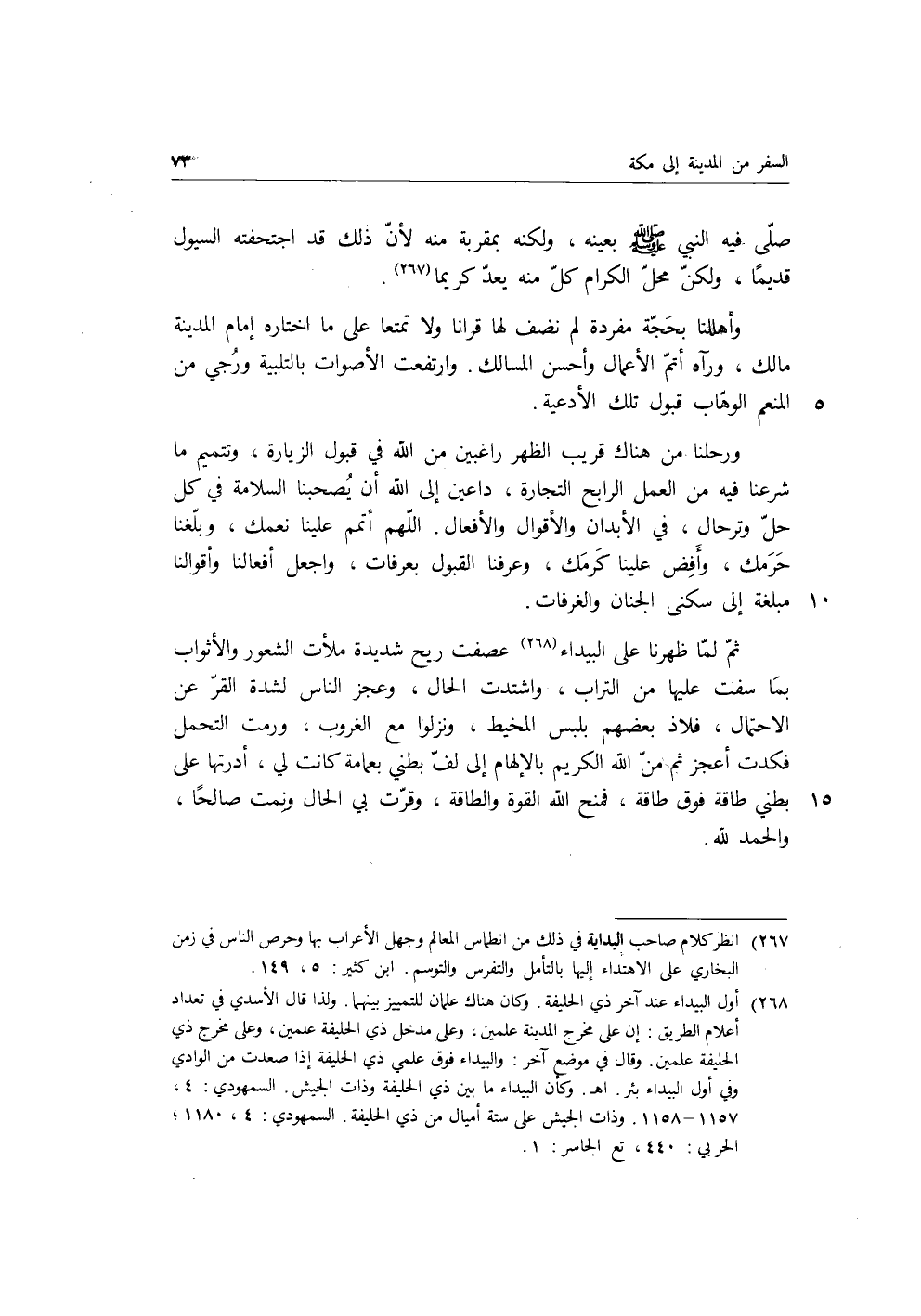 ثم لما ظهرنا على البيداء عصفت ريح شديدة ملأت الشعور والأثواب بما سفت عليها من التراب، واشتدت الحال، وعجز الناس لشدة القر عن الاحتمال، فلاذ بعضهم بلبس المخيط، ونزلوا مع الغروب، ورمت التحمل فكدت أعجز ثم من الله الكريم بالإلهام إلى لف بطني بعمامة كانت لي، أدرتها على بطني طاقة فوق طاقة، فمنح الله القوة والطاقة، وقرت بي الحال ونمت صالحا، والحمد لله.