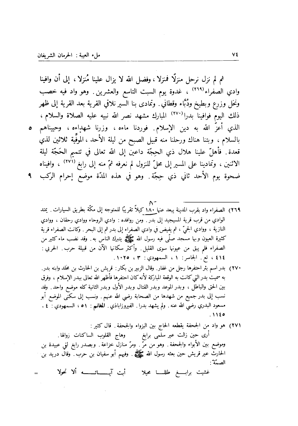 ثم لم نزل نرحل منزلا فمنزلا، وفضل الله لا يزال علينا منزلا، إلى أن وافينا وادي الصفراء، غدوة يوم السبت التاسع والعشرين، وهو واد فيه خصب ونخل وزرع وبطيخ ودباء وقطاني، وتمادى بنا السير نلاقي القرية بعد القرية إلى ظهر ذلك اليوم فوافينا بدرا، المبارك مشهد نصر الله نبيه عليه الصلاة والسلام.