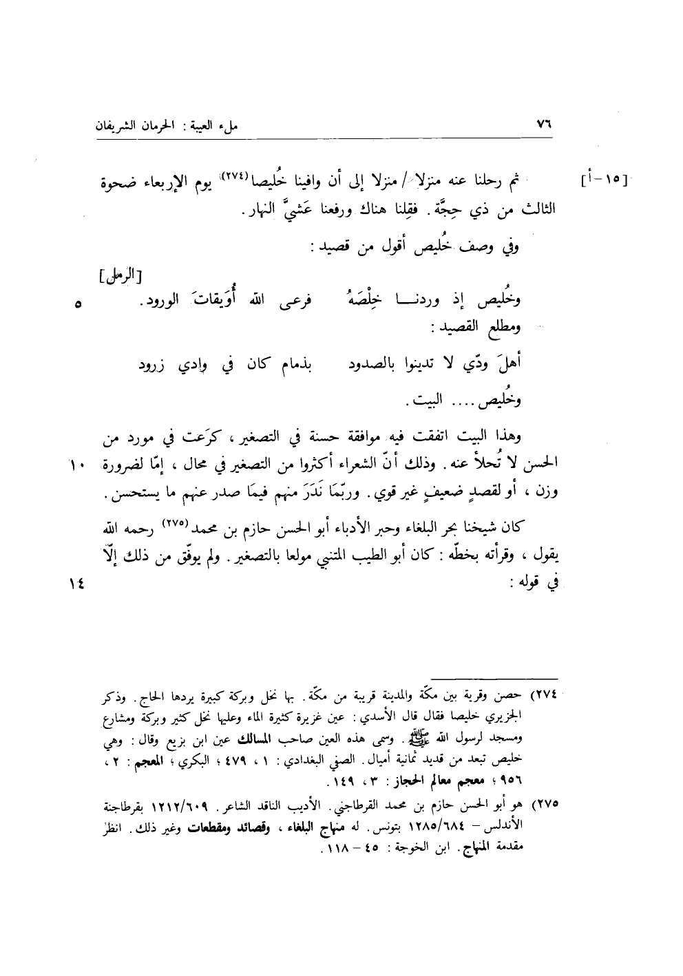 ثم رحلنا عنه منزلا منزلا إلى آن وافينا خليصا يوم الأربعاء ضحوة الثالث من ذي حجة، فقلنا هناك ورفعنا عشي النهار.
