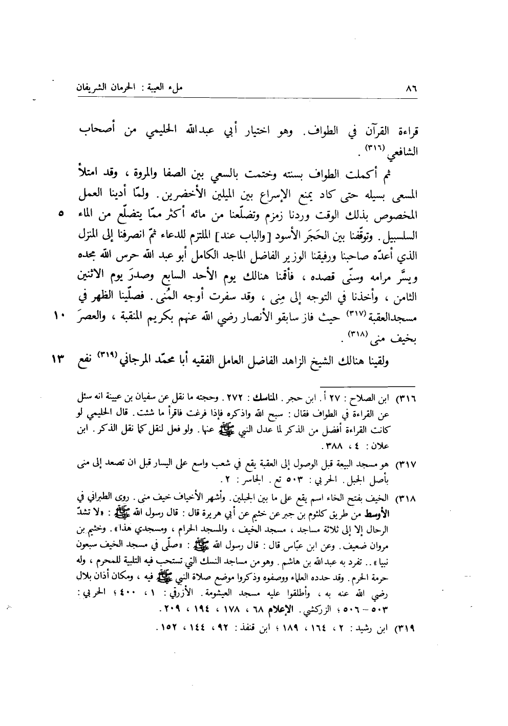 ثم أكملت الطواف بسنته وختمت بالسعي بين الصفا والمروة، وقد امتلأ المسعى بسيله حتى كاد يمنع الإسراع بين الميلين الأخضرين، ولما أدينا العمل المخصوص بذلك الوقت وردنا زمزم وتضلعنا من مائه أكثر مما يتضلع من الماء السلسبيل، وتوقفنا بين الحجر الأسود والباب عند الملتزم للدعاء ثم انصرفنا إلى المنزل الذي أعده صاحبنا ورفيقنا الوزير الفاضل الماجد الكامل أبو عبد الله حرس الله مجده، ويسر مرامه وسنى قصده، فأقمنا هنالك يوم الأحد السابع وصدر يوم الاثنين الثامن، وأخذنا في التوجه إلى منى، وقد سفرت أوجه المنى، فصلينا الظهر في مسجد العقبة، حيث فاز سابقو الأنصار رضي الله عنهم بكريم المنقبة، والعصر بخيف منى.