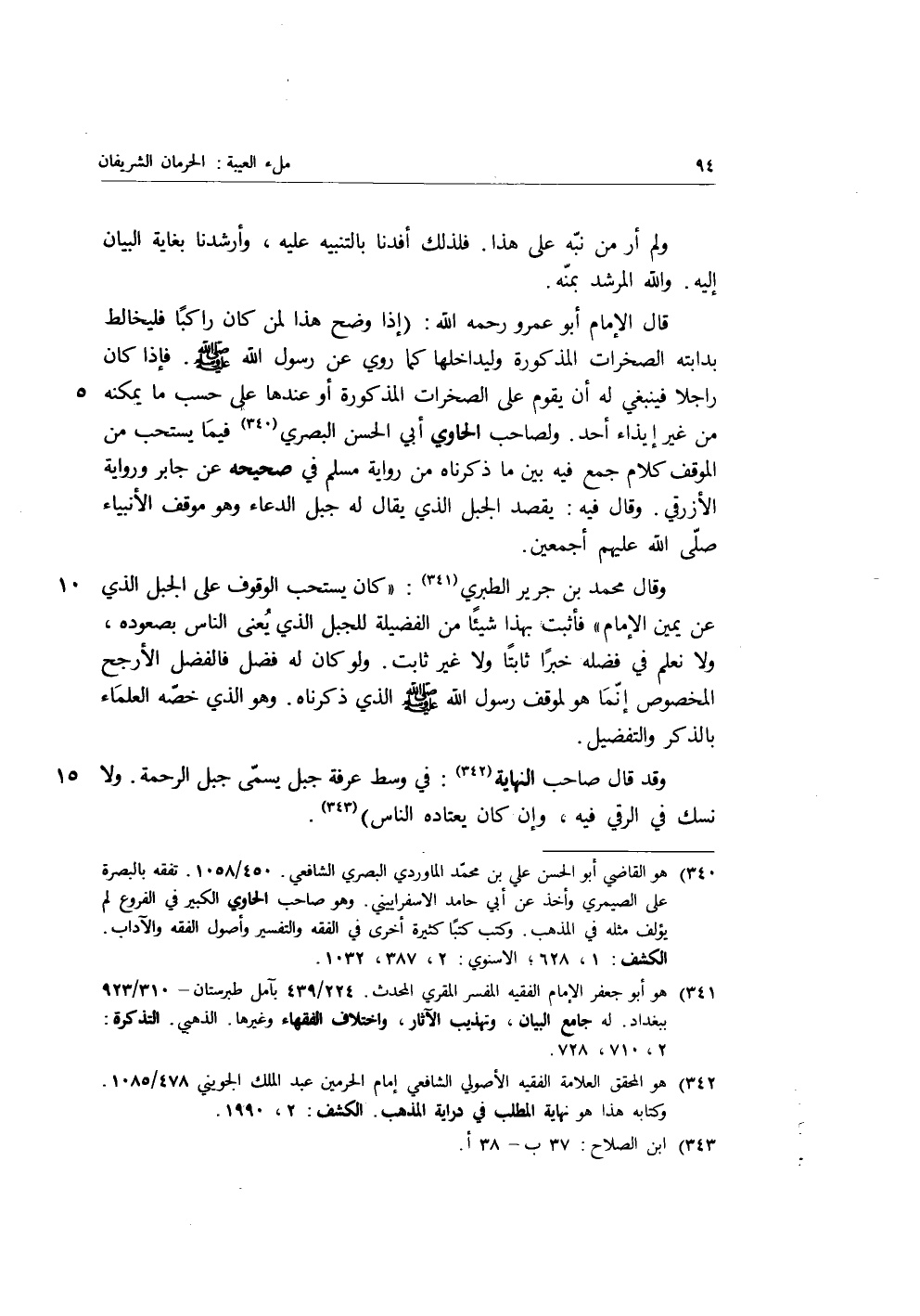 قال الإمام أبو عمرو رحمه الله: إذا وضح هذا لمن كان راكبا فليخالط بدابته الصخرات المذكورة وليداخلها كما روي عَنْ رَسُولِ اللَّهِ صَلَّى اللَّهُ عَلَيْهِ وَسَلَّمَ، فإذا كان راجلا فينبغي له أن يقوم على الصخرات المذكور أو عندها على حسب ما يمكنه من غير إيذاء أحد، ولصاحب الحاوي أبي الحسن البصري، فيما يستحب من الموقف كلام جمع فيه بين ما ذكرناه من رواية مسلم في صحيحه عن جابر ورواية الأزرقي، وقال فيه: يقصد الجبل الذي يقال له جبل الدعاء وهو موقف الأنبياء صَلَّى اللَّهُ عَلَيْهِ وَسَلَّمَ أجمعين.