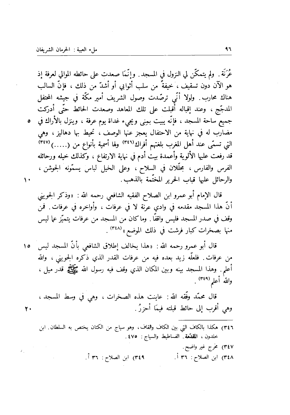 عرنة ولم يتمكن لي النزول في المسجد، وإنما صعدت على حائطه الموالي لعرفة إذ هو الآن دون تسقيف، خفية من سلب أثوابي أو أشد من ذلك، فإن السالب هناك محارب، ولولا أني ترصدت وصول الشريف أمير مكة في جيشه المحتفل المدجج، وعند إقباله أقبلت على تلك المعاهد وصعدت الحائط حتى أدركت جميع ساحة المسجد، فإنه يبيت بمنى ويجئ غداة يوم عرفة، وينزل بالأراك في مضارب له في نهاية من الاحتفال يعجز عنها الوصف، تحيط بها دهاليز، وهي التي تسمى عند أهل المغرب بلغتهم أفراك، ولها أسمية بأنواع من. . . . . قد رفعت عليها الألوية وأعمدة بيت أدم في نهاية الارتفاع، وكذلك خيله ورحائله الفرس والفارس، مجللان في السلاح، وعلى الخيل لباس يسمونه الجوشن والرحائل عليها قباب الحرير المختمة بالذهب.