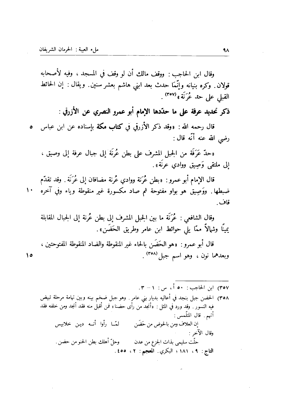 ذكر تحديد عرفة على ما حددها الإمام أبو عمرو النصري عن الأزرقي: قال رحمه الله: وقد ذكر الأزرقي في كتاب مكة بإسناده عن ابن عباس رضي الله عنه أنه قَالَ: «حد عرفة من الجبل المشرف على بطن عرنة إلى جبال عرفة إلى وصيق، إلى ملتقى وصيق ووادي عرنة» قال الإمام أبو عمرو: بطن عرنة ووادي عرنة مضافان على عرنة، وقد تقدم ضبطها، ووصيق هو بواو مفتوحة ثم صاد مك { [غير منقوطة وياء وفي آخره قاف.