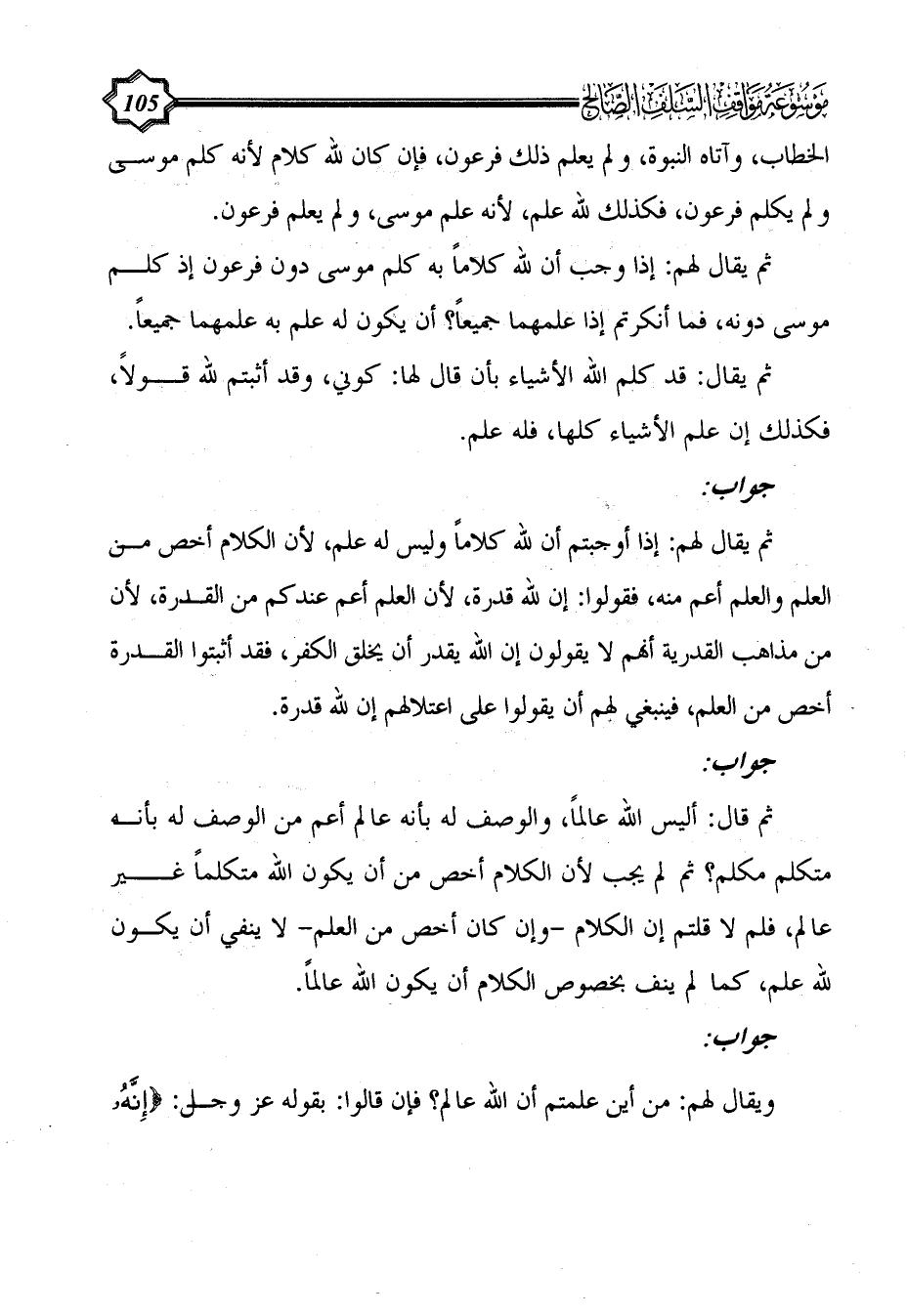 ثم يقال لهم: إذا أوجبتم أن لله كلاماً وليس له علم، لأن الكلام أخص من العلم والعلم أعم منه، فقولوا: إن لله قدرة، لأن العلم أعم عندكم من القدرة، لأن من مذاهب القدرية أنهم لا يقولون إن الله يقدر أن يخلق الكفر، فقد أثبتوا القدرة أخص من العلم، فينبغي لهم أن يقولوا على اعتلالهم إن لله قدرة.