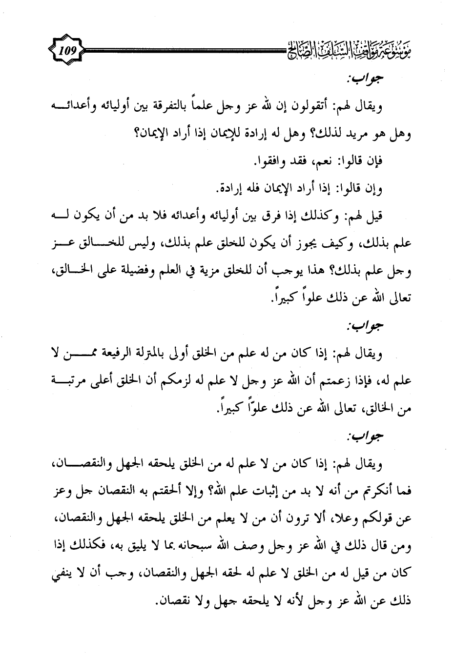 ويقال لهم: أتقولون إن لله عز وجل علماً بالتفرقة بين أوليائه وأعدائه وهل هو مريد لذلك؟ وهل له إرادة للإيمان إذا أراد الإيمان؟
