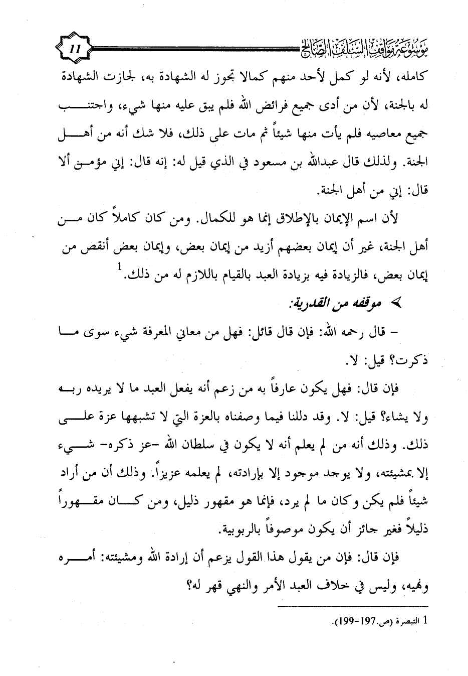 فإن قال: فهل يكون عارفاً به من زعم أنه يفعل العبد ما لا يريده ربه ولا يشاء؟ قيل: لا. وقد دللنا فيما وصفناه بالعزة التي لا تشبهها عزة على ذلك. وذلك أنه من لم يعلم أنه لا يكون في سلطان الله -عز ذكره- شيء إلا بمشيئته، ولا يوجد موجود إلا بإرادته، لم يعلمه عزيزاً. وذلك أن من أراد شيئاً فلم يكن وكان ما لم يرد، فإنما هو مقهور ذليل، ومن كان مقهوراً ذليلاً فغير جائز أن يكون موصوفاً بالربوبية.