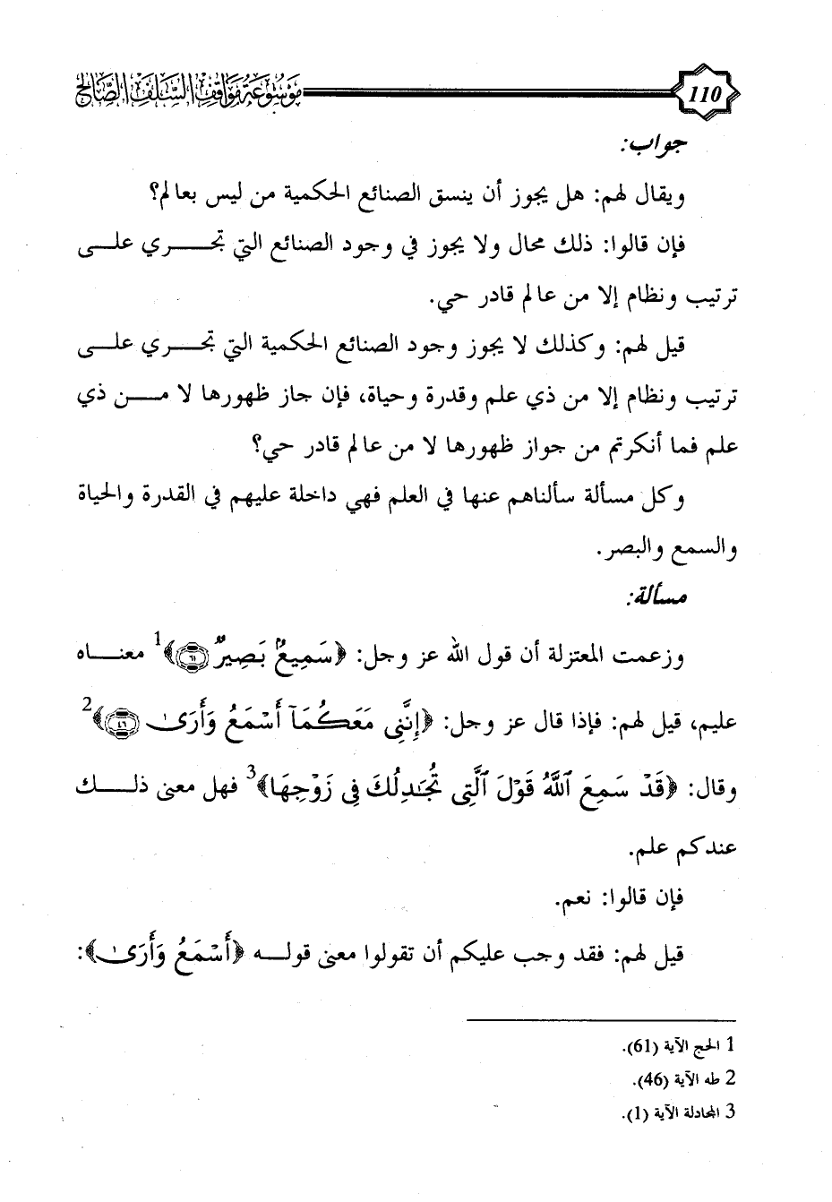 وزعمت المعتزلة أن قول الله عز وجل: {سميع بصير} (¬1) معناه عليم، قيل لهم: فإذا قال عز وجل: {إِنَّنِي مَعَكُمَا أسمع وأرى} (¬2) وقال: {قد سمع الله قول التي تجادلك في زوجها} (¬3) فهل معنى ذلك عندكم علم.