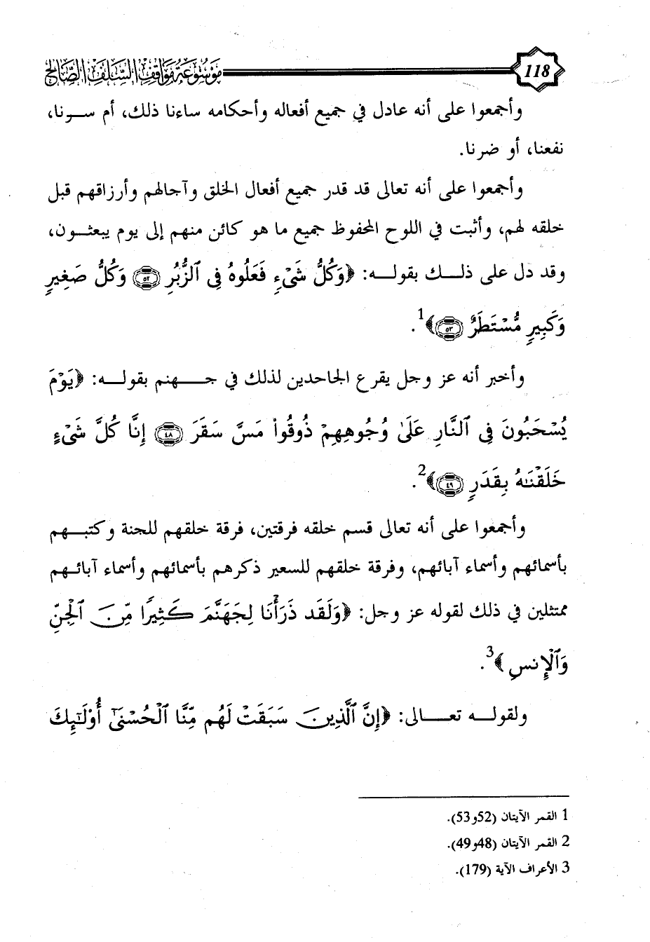 وأجمعوا على أنه تعالى قسم خلقه فرقتين، فرقة خلقهم للجنة وكتبهم بأسمائهم وأسماء آبائهم، وفرقة خلقهم للسعير ذكرهم بأسمائهم وأسماء آبائهم ممتثلين في ذلك لقوله عز وجل: {وَلَقَدْ ذَرَأْنَا لِجَهَنَّمَ كَثِيرًا مِنَ الْجِنِّ وَالْإِنْسِ} (¬3).