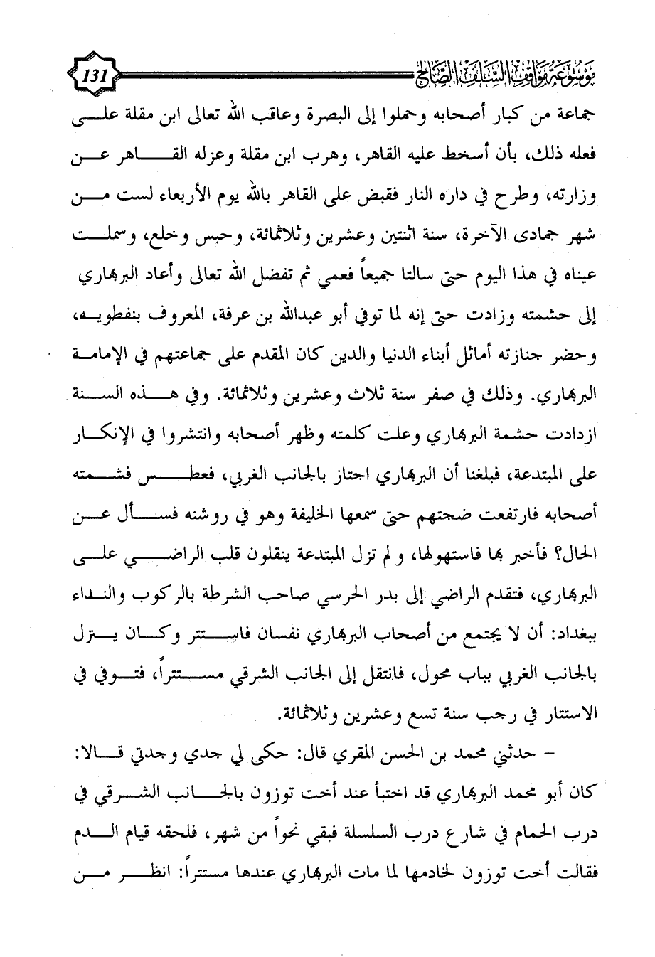 جماعة من كبار أصحابه وحملوا إلى البصرة وعاقب الله تعالى ابن مقلة على فعله ذلك، بأن أسخط عليه القاهر، وهرب ابن مقلة وعزله القاهر عن وزارته، وطرح في داره النار فقبض على القاهر بالله يوم الأربعاء لست من شهر جمادى الآخرة، سنة اثنتين وعشرين وثلاثمائة، وحبس وخلع، وسملت عيناه في هذا اليوم حتى سالتا جميعاً فعمي ثم تفضل الله تعالى وأعاد البربهاري إلى حشمته وزادت حتى إنه لما توفي أبو عبد الله بن عرفة، المعروف بنفطويه، وحضر جنازته أماثل أبناء الدنيا والدين كان المقدم على جماعتهم في الإمامة البربهاري. وذلك في صفر سنة ثلاث وعشرين وثلاثمائة. وفي هذه السنة ازدادت حشمة البربهاري وعلت كلمته وظهر أصحابه وانتشروا في الإنكار على المبتدعة، فبلغنا أن البربهاري اجتاز بالجانب الغربي، فعطس فشمته أصحابه فارتفعت ضجتهم حتى سمعها الخليفة وهو في روشنه فسأل عن الحال؟ فأخبر بها فاستهولها، ولم تزل المبتدعة ينقلون قلب الراضي على البربهاري، فتقدم الراضي إلى بدر الحرسي صاحب الشرطة بالركوب والنداء ببغداد: أن لا يجتمع من أصحاب البربهاري نفسان فاستتر وكان ينزل بالجانب الغربي بباب محول، فانتقل إلى الجانب الشرقي مستتراً، فتوفي في الاستتار في رجب سنة تسع وعشرين وثلاثمائة.
