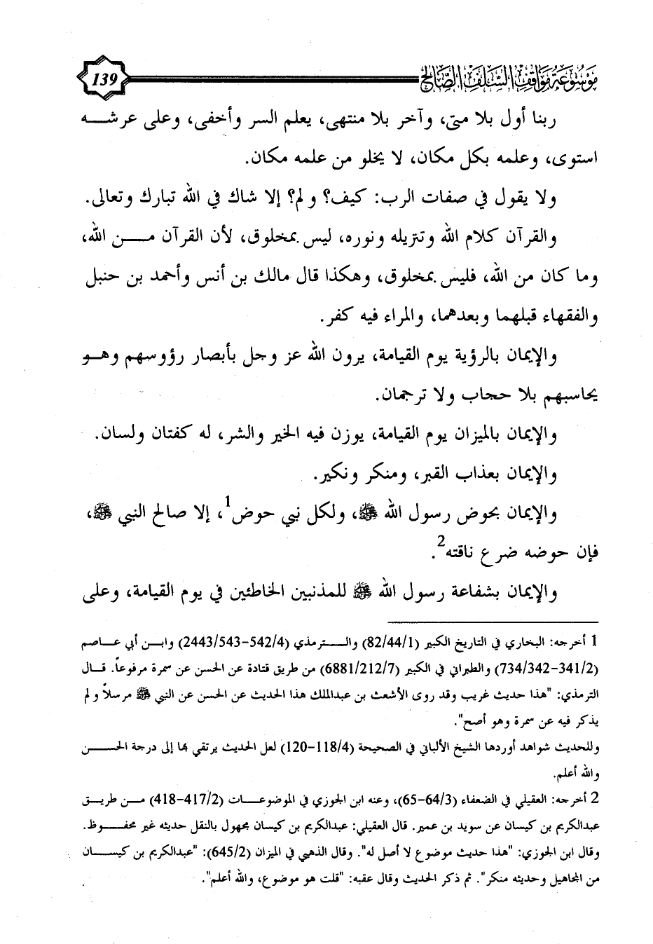 والإيمان بحوض رسول الله - صلى الله عليه وسلم -، ولكل نبي حوض (¬1)، إلا صالح النبي - صلى الله عليه وسلم -، فإن حوضه ضرع ناقته (¬2).