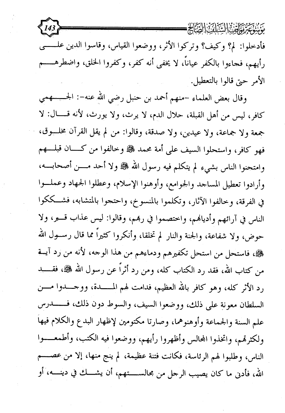 وقال بعض العلماء -منهم أحمد بن حنبل رضي الله عنه-: الجهمي كافر، ليس من أهل القبلة، حلال الدم، لا يرث، ولا يورث، لأنه قال: لا جمعة ولا جماعة، ولا عيدين، ولا صدقة، وقالوا: من لم يقل القرآن مخلوق، فهو كافر، واستحلوا السيف على أمة محمد - صلى الله عليه وسلم - وخالفوا من كان قبلهم وامتحنوا الناس بشيء لم يتكلم فيه رسول الله - صلى الله عليه وسلم - ولا أحد من أصحابه، وأرادوا تعطيل المساجد والجوامع، وأوهنوا الإسلام، وعطلوا الجهاد وعملوا في الفرقة، وخالفوا الآثار، وتكلموا بالمنسوخ، واحتجوا بالمتشابه، فشككوا الناس في آرائهم وأديانهم، واختصموا في ربهم، وقالوا: ليس عذاب قبر، ولا حوض، ولا شفاعة، والجنة والنار لم تخلقا، وأنكروا كثيراً مما قال رسول الله - صلى الله عليه وسلم -، فاستحل من استحل تكفيرهم ودماءهم من هذا الوجه، لأنه من رد آية من كتاب الله، فقد رد الكتاب كله، ومن رد أثراً عن رسول الله - صلى الله عليه وسلم -، فقد رد الأثر كله، وهو كافر بالله العظيم، فدامت لهم المدة، ووجدوا من السلطان معونة على ذلك، ووضعوا السيف، والسوط دون ذلك، فدرس علم السنة والجماعة وأوهنوهما، وصارتا مكتومين لإظهار البدع والكلام فيها ولكثرتهم، واتخذوا المجالس وأظهروا رأيهم، ووضعوا فيه الكتب، وأطمعوا الناس، وطلبوا لهم الرئاسة، فكانت فتنة عظيمة، لم ينج منها، إلا من عصم الله، فأدنى ما كان يصيب الرجل من مجالستهم، أن يشك في دينه، أو