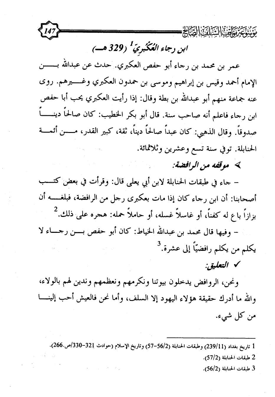 - جاء في طبقات الحنابلة لابن أبي يعلى قال: وقرأت في بعض كتب أصحابنا: أن ابن رجاء كان إذا مات بعكبرى رجل من الرافضة، فبلغه أن بزازاً باع له كفناً، أو غاسلاً غسله، أو حاملاً حمله: هجره على ذلك. (¬2)