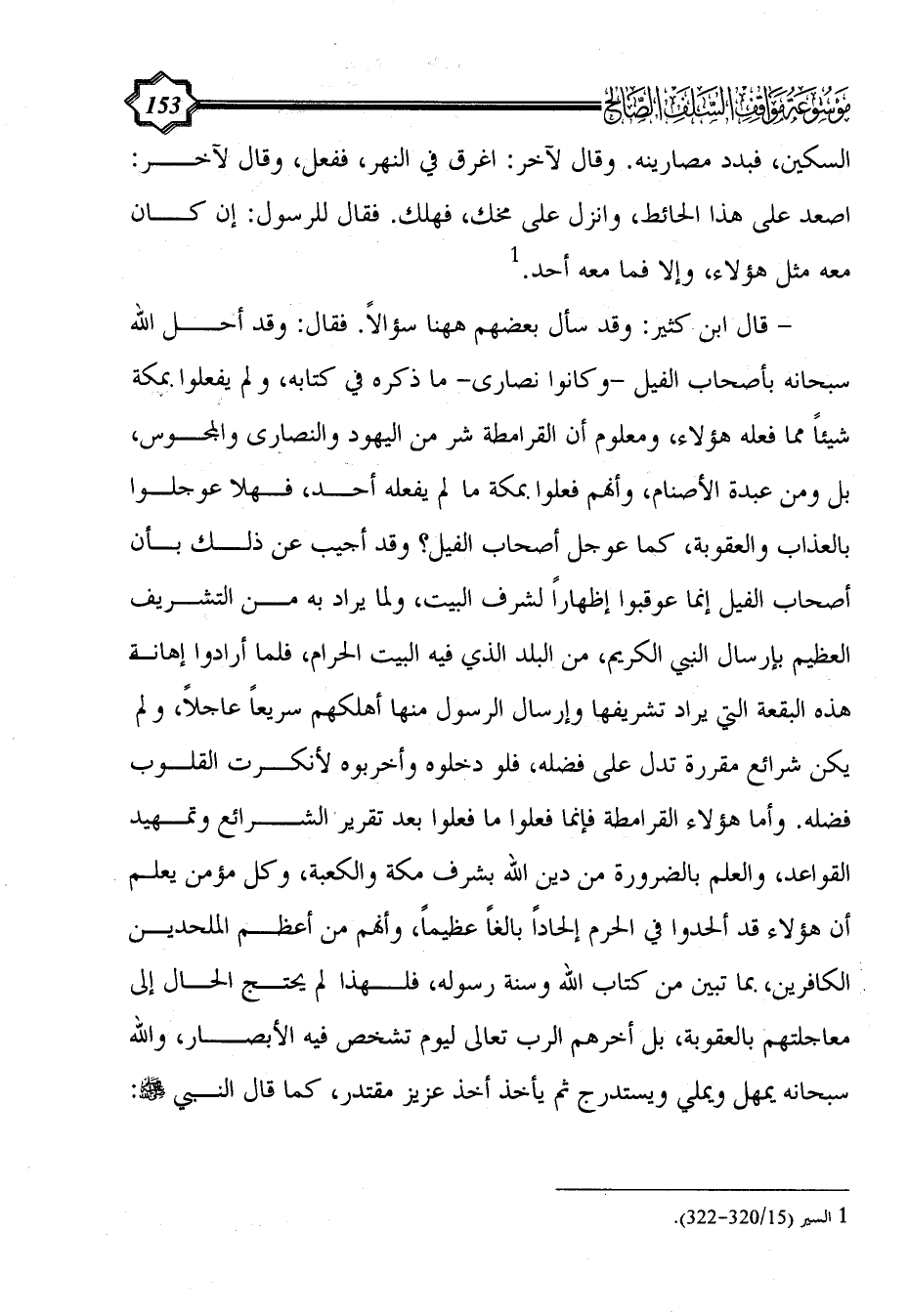 - قال ابن كثير: وقد سأل بعضهم ههنا سؤالاً. فقال: وقد أحل الله سبحانه بأصحاب الفيل -وكانوا نصارى- ما ذكره في كتابه، ولم يفعلوا بمكة شيئاً مما فعله هؤلاء، ومعلوم أن القرامطة شر من اليهود والنصارى والمجوس، بل ومن عبدة الأصنام، وأنهم فعلوا بمكة ما لم يفعله أحد، فهلا عوجلوا بالعذاب والعقوبة، كما عوجل أصحاب الفيل؟ وقد أجيب عن ذلك بأن أصحاب الفيل إنما عوقبوا إظهاراً لشرف البيت، ولما يراد به من التشريف العظيم بإرسال النبي الكريم، من البلد الذي فيه البيت الحرام، فلما أرادوا إهانة هذه البقعة التي يراد تشريفها وإرسال الرسول منها أهلكهم سريعاً عاجلاً، ولم يكن شرائع مقررة تدل على فضله، فلو دخلوه وأخربوه لأنكرت القلوب فضله. وأما هؤلاء القرامطة فإنما فعلوا ما فعلوا بعد تقرير الشرائع وتمهيد القواعد، والعلم بالضرورة من دين الله بشرف مكة والكعبة، وكل مؤمن يعلم أن هؤلاء قد ألحدوا في الحرم إلحاداً بالغاً عظيماً، وأنهم من أعظم الملحدين الكافرين، بما تبين من كتاب الله وسنة رسوله، فلهذا لم يحتج الحال إلى معاجلتهم بالعقوبة، بل أخرهم الرب تعالى ليوم تشخص فيه الأبصار، والله سبحانه يمهل ويملي ويستدرج ثم يأخذ أخذ عزيز مقتدر، كما قال النبي - صلى الله عليه وسلم -: