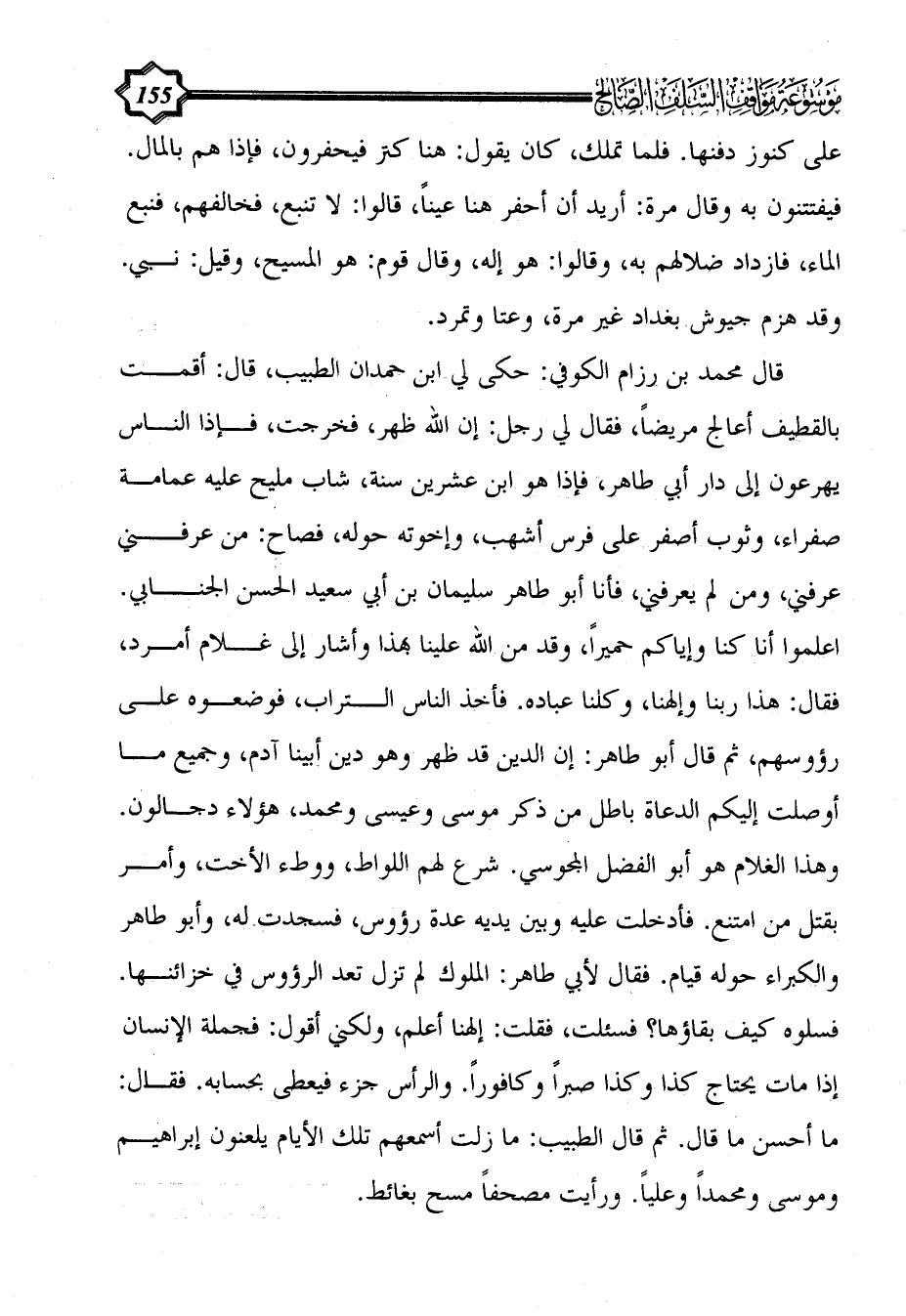 على كنوز دفنها. فلما تملك، كان يقول: هنا كنز فيحفرون، فإذا هم بالمال. فيفتتنون به وقال مرة: أريد أن أحفر هنا عيناً، قالوا: لا تنبع، فخالفهم، فنبع الماء، فازداد ضلالهم به، وقالوا: هو إله، وقال قوم: هو المسيح، وقيل: نبي. وقد هزم جيوش بغداد غير مرة، وعتا وتمرد.