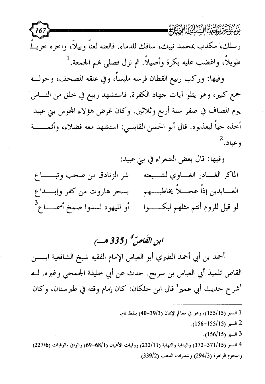 وفيها: وركب ربيع القطان فرسه ملبساً، وفي عنقه المصحف، وحوله جمع كبير، وهو يتلو آيات جهاد الكفرة. فاستشهد ربيع في خلق من الناس يوم المصاف في صفر سنة أربع وثلاثين. وكان غرض هؤلاء المجوس بني عبيد أخذه حياً ليعذبوه. قال أبو الحسن القابسي: استشهد معه فضلاء، وأئمة وعباد. (¬2)