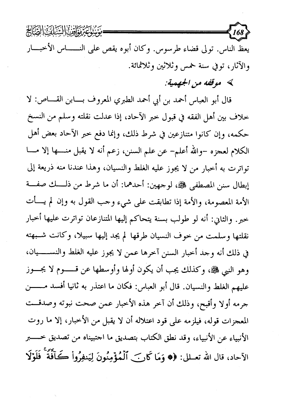 قال أبو العباس أحمد بن أبي أحمد الطبري المعروف بابن القاص: لا خلاف بين أهل الفقه في قبول خبر الآحاد، إذا عدلت نقلته وسلم من النسخ حكمه، وإن كانوا متنازعين في شرط ذلك، وإنما دفع خبر الآحاد بعض أهل الكلام لعجزه -والله أعلم- عن علم السنن، زعم أنه لا يقبل منها إلا ما تواترت به أخبار من لا يجوز عليه الغلط والنسيان، وهذا عندنا منه ذريعة إلى إبطال سنن المصطفى - صلى الله عليه وسلم -، لوجهين: أحدهما: أن ما شرط من ذلك صفة الأمة المعصومة، والأمة إذا تطابقت على شيء وجب القول به وإن لم يأت خبر. والثاني: أنه لو طولب بسنة يتحاكم إليها المتنازعان تواترت عليها أخبار نقلتها وسلمت من خوف النسيان طرقها لم يجد إليها سبيلاً، وكانت شبهته في ذلك أنه وجد أخبار السنن آخرها عمن لا يجوز عليه الغلط والنسيان، وهو النبي - صلى الله عليه وسلم -، وكذلك يجب أن يكون أولها وأوسطها عن قوم لا يجوز عليهم الغلط والنسيان. قال أبو العباس: فكان ما اعتذر به ثانيا أفسد من جرمه أولا وأقبح، وذلك أن آخر هذه الأخبار عمن صحت نبوته وصدقت المعجزات قوله، فيلزمه على قود اعتلاله أن لا يقبل من الأخبار، إلا ما روت الأنبياء عن الأنبياء، وقد نطق الكتاب بتصديق ما اجتبيناه من تصديق خبر الآحاد، قال الله تعالى: {وَمَا كَانَ الْمُؤْمِنُونَ لِيَنْفِرُوا كَافَّةً فَلَوْلَا