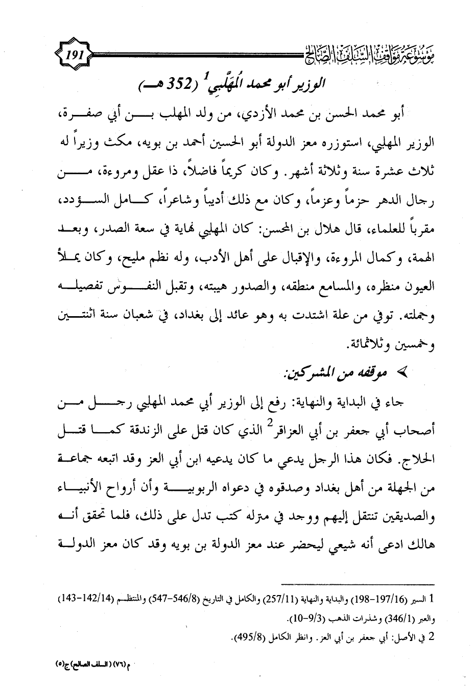 جاء في البداية والنهاية: رفع إلى الوزير أبي محمد المهلبي رجل من أصحاب أبي جعفر بن أبي العزاقر (¬2) الذي كان قتل على الزندقة كما قتل الحلاج. فكان هذا الرجل يدعي ما كان يدعيه ابن أبي العز وقد اتبعه جماعة من الجهلة من أهل بغداد وصدقوه في دعواه الربوبية وأن أرواح الأنبياء والصديقين تنتقل إليهم ووجد في منزله كتب تدل على ذلك، فلما تحقق أنه هالك ادعى أنه شيعي ليحضر عند معز الدولة بن بويه وقد كان معز الدولة