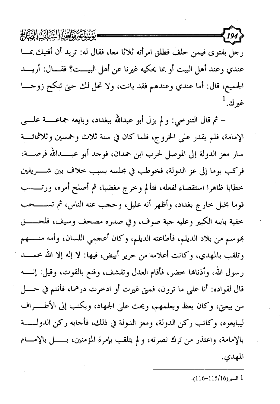 - ثم قال التنوخي: ولم يزل أبو عبد الله ببغداد، وبايعه جماعة على الإمامة، فلم يقدر على الخروج، فلما كان في سنة ثلاث وخمسين وثلاثمائة سار معز الدولة إلى الموصل لحرب ابن حمدان، فوجد أبو عبد الله فرصة، فركب يوماً إلى عز الدولة، فخوطب في مجلسه بسبب خلاف بين شريفين خطاباً ظاهراً استقصاء لفعله، فتألم وخرج مغضباً، ثم أصلح أمره، ورتب قوماً بخيل خارج بغداد، وأظهر أنه عليل، وحجب عنه الناس، ثم تسحب خفية بابنه الكبير وعليه جبة صوف، وفي صدره مصحف وسيف، فلحق بهوسم من بلاد الديلم، فأطاعته الديلم، وكان أعجمي اللسان، وأمه منهم وتلقب بالمهدي، وكانت أعلامه من حرير أبيض، فيها: لا إله إلا الله محمد رسول الله، وأذنابها خضر، فأقام العدل وتقشف، وقنع بالقوت، وقيل: إنه قال لقواده: أنا على ما ترون، فمتى غيرت أو ادخرت درهماً، فأنتم في حل من بيعتي، وكان يعظ ويعلمهم، ويحث على الجهاد، ويكتب إلى الأطراف ليبايعوه، وكاتب ركن الدولة، ومعز الدولة في ذلك، فأجابه ركن الدولة بالإمامة، واعتذر من ترك نصرته، ولم يتلقب بإمرة المؤمنين، بل بالإمام المهدي.