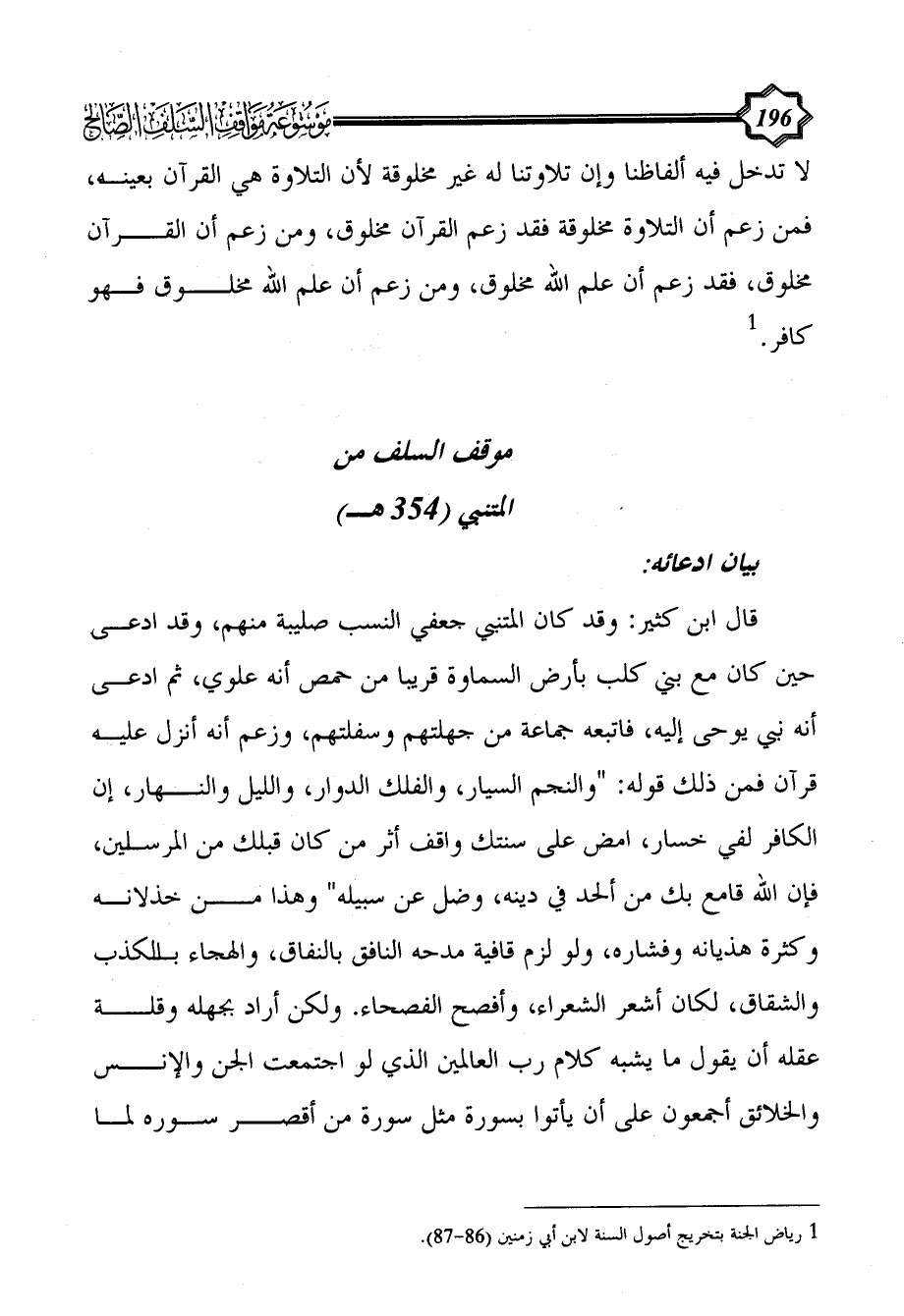 قال ابن كثير: وقد كان المتنبي جعفي النسب صليبة منهم، وقد ادعى حين كان مع بني كلب بأرض السماوة قريباً من حمص أنه علوي، ثم ادعى أنه نبي يوحى إليه، فاتبعه جماعة من جهلتهم وسفلتهم، وزعم أنه أنزل عليه قرآن فمن ذلك قوله: "والنجم السيار، والفلك الدوار، والليل والنهار، إن الكافر لفي خسار، امض على سنتك واقف أثر من كان قبلك من المرسلين، فإن الله قامع بك من ألحد في دينه، وضل عن سبيله" وهذا من خذلانه وكثرة هذيانه وفشاره، ولو لزم قافية مدحه النافق بالنفاق، والهجاء بالكذب والشقاق، لكان أشعر الشعراء، وأفصح الفصحاء. ولكن أراد بجهله وقلة عقله أن يقول ما يشبه كلام رب العالمين الذي لو اجتمعت الجن والإنس والخلائق أجمعون على أن يأتوا بسورة مثل سورة من أقصر سوره لما