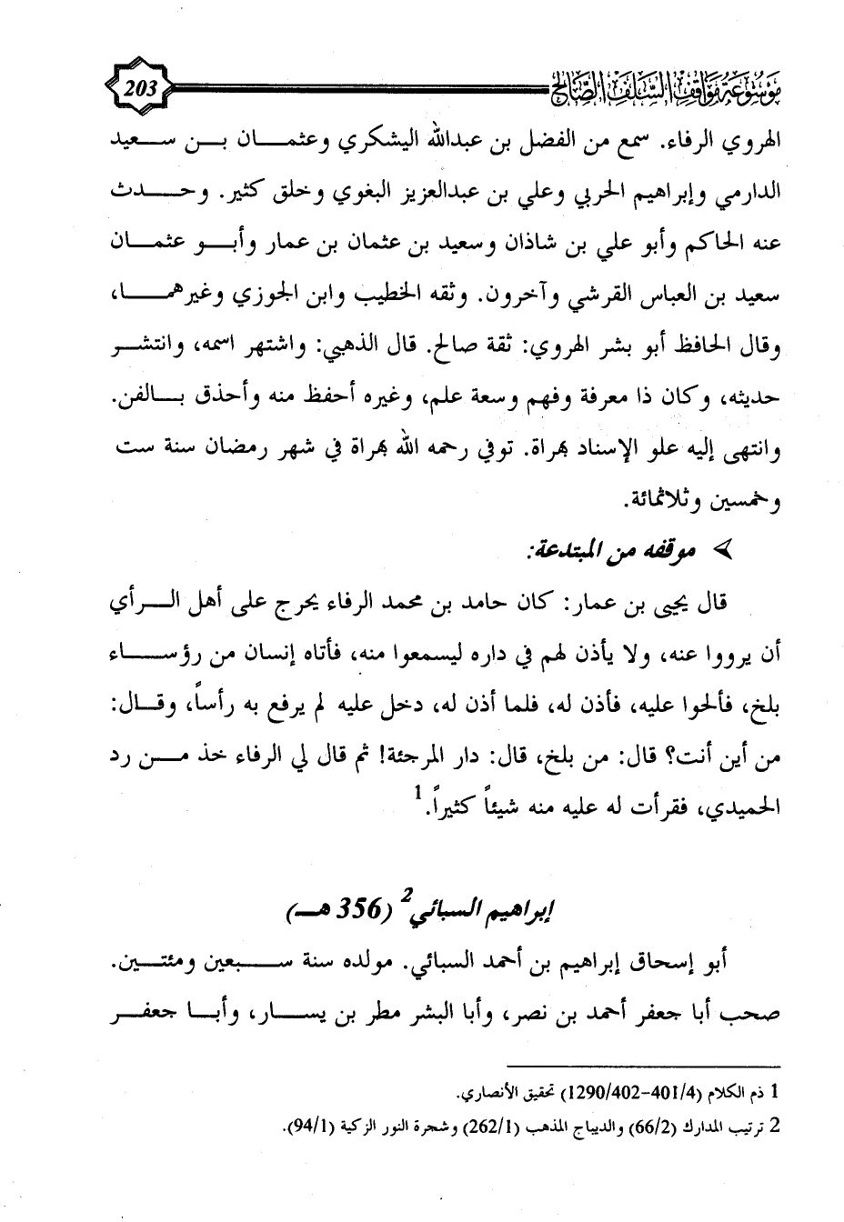 قال يحيى بن عمار: كان حامد بن محمد الرفاء يحرج على أهل الرأي أن يرووا عنه، ولا يأذن لهم في داره ليسمعوا منه، فأتاه إنسان من رؤساء بلخ، فألحوا عليه، فأذن له، فلما أذن له، دخل عليه لم يرفع به رأساً، وقال: من أين أنت؟ قال: من بلخ، قال: دار المرجئة! ثم قال لي الرفاء خذ من رد الحميدي، فقرأت له عليه منه شيئاً كثيراً. (¬1)
