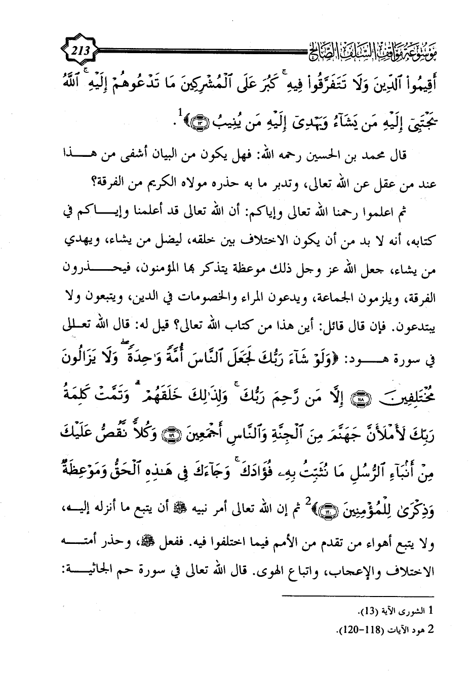 أَقِيمُوا الدِّينَ وَلَا تَتَفَرَّقُوا فِيهِ كَبُرَ عَلَى الْمُشْرِكِينَ مَا تَدْعُوهُمْ إِلَيْهِ اللَّهُ يَجْتَبِي إِلَيْهِ مَنْ يَشَاءُ وَيَهْدِي إِلَيْهِ مَنْ يُنِيبُ} (¬1).