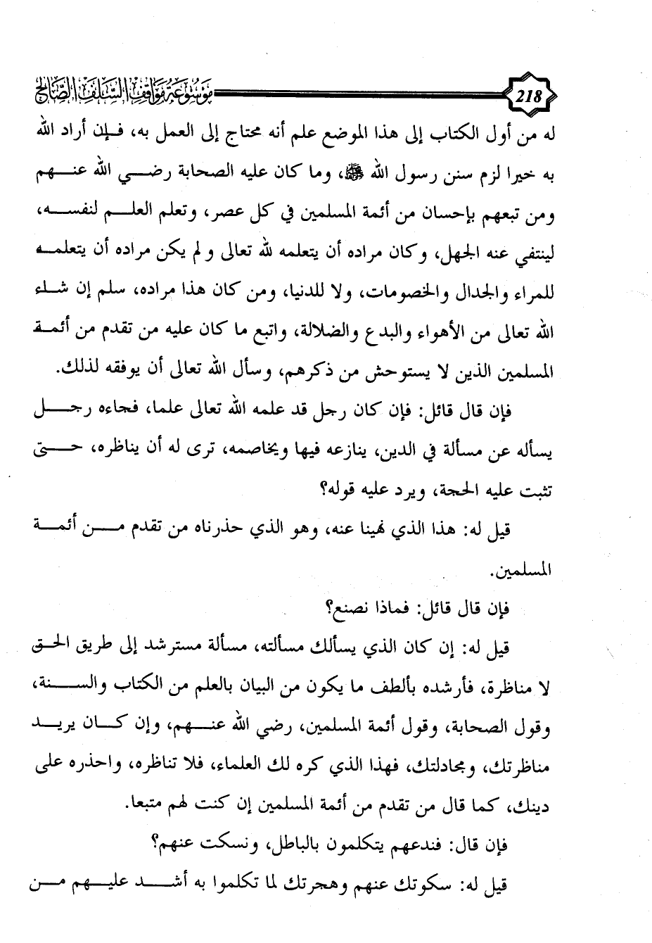 له من أول الكتاب إلى هذا الموضع علم أنه محتاج إلى العمل به، فإن أراد الله به خيراً لزم سنن رسول الله - صلى الله عليه وسلم -، وما كان عليه الصحابة رضي الله عنهم ومن تبعهم بإحسان من أئمة المسلمين في كل عصر، وتعلم العلم لنفسه، لينتفي عنه الجهل، وكان مراده أن يتعلمه لله تعالى ولم يكن مراده أن يتعلمه للمراء والجدال والخصومات، ولا للدنيا، ومن كان هذا مراده، سلم إن شاء الله تعالى من الأهواء والبدع والضلالة، واتبع ما كان عليه من تقدم من أئمة المسلمين الذين لا يستوحش من ذكرهم، وسأل الله تعالى أن يوفقه لذلك.