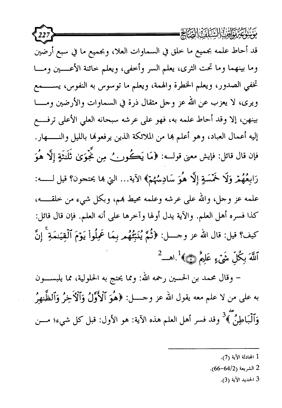 قد أحاط علمه بجميع ما خلق في السماوات العلا، وبجميع ما في سبع أرضين وما بينهما وما تحت الثرى، يعلم السر وأخفى، ويعلم خائنة الأعين وما تخفي الصدور، ويعلم الخطرة والهمة، ويعلم ما توسوس به النفوس، يسمع ويرى، لا يعزب عن الله عز وجل مثقال ذرة في السماوات والأرضين وما بينهن، إلا وقد أحاط علمه به، فهو على عرشه سبحانه العلي الأعلى ترفع إليه أعمال العباد، وهو أعلم بها من الملائكة الذين يرفعونها بالليل والنهار. فإن قال قائل: فإيش معنى قوله: {مَا يَكُونُ مِنْ نَجْوَى ثَلَاثَةٍ إِلَّا هُوَ رَابِعُهُمْ وَلَا خَمْسَةٍ إِلَّا هُوَ سَادِسُهُمْ} الآية ... التي بها يحتجون؟ قيل له: علمه عز وجل، والله على عرشه وعلمه محيط بهم، وبكل شيء من خلقه، كذا فسره أهل العلم. والآية يدل أولها وآخرها على أنه العلم. فإن قال قائل: كيف؟ قيل: قال الله عز وجل: {ثُمَّ يُنَبِّئُهُمْ بِمَا عَمِلُوا يَوْمَ الْقِيَامَةِ إِنَّ اللَّهَ بِكُلِّ شَيْءٍ عَلِيمٌ} (¬1).اهـ (¬2)